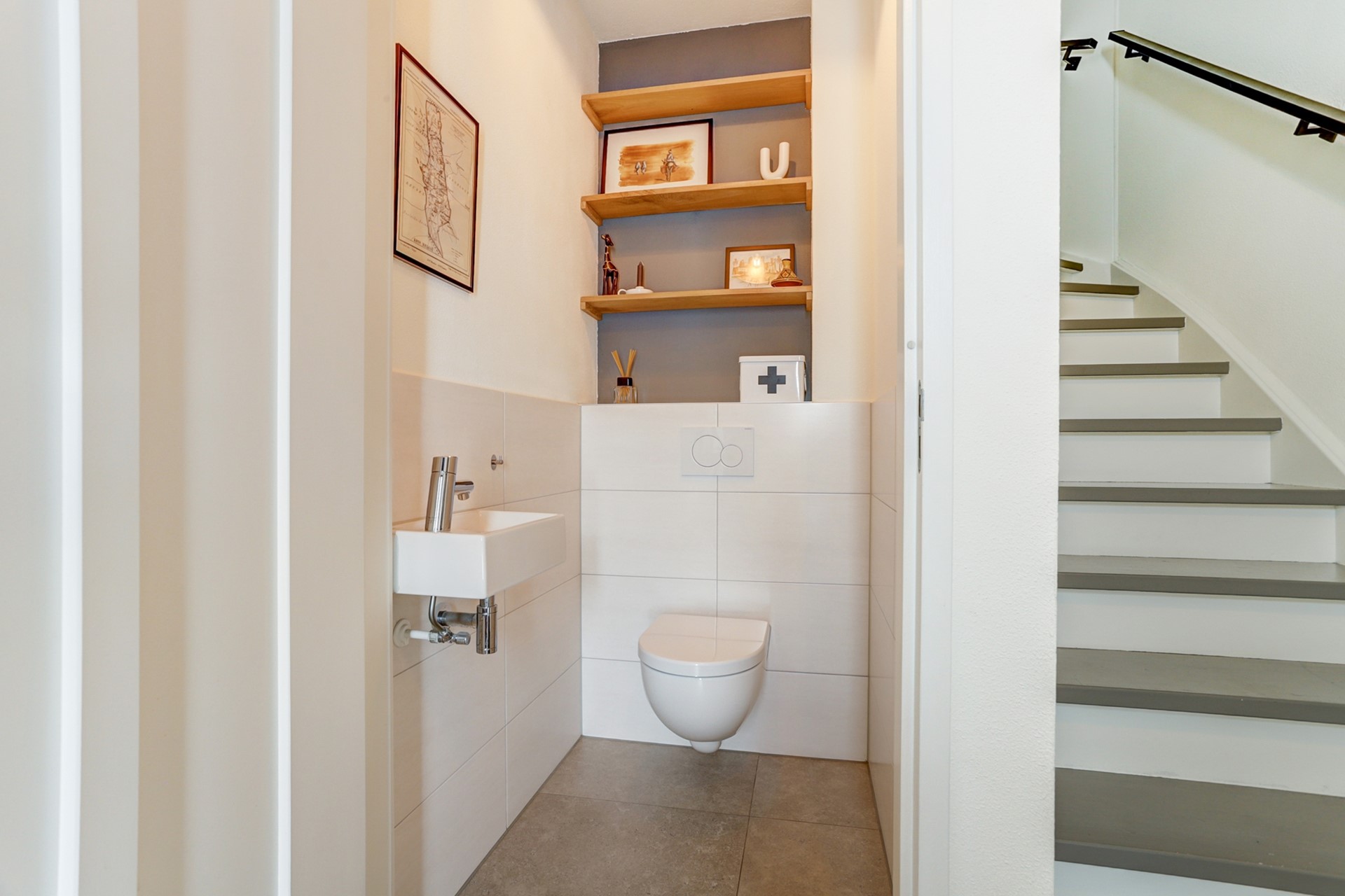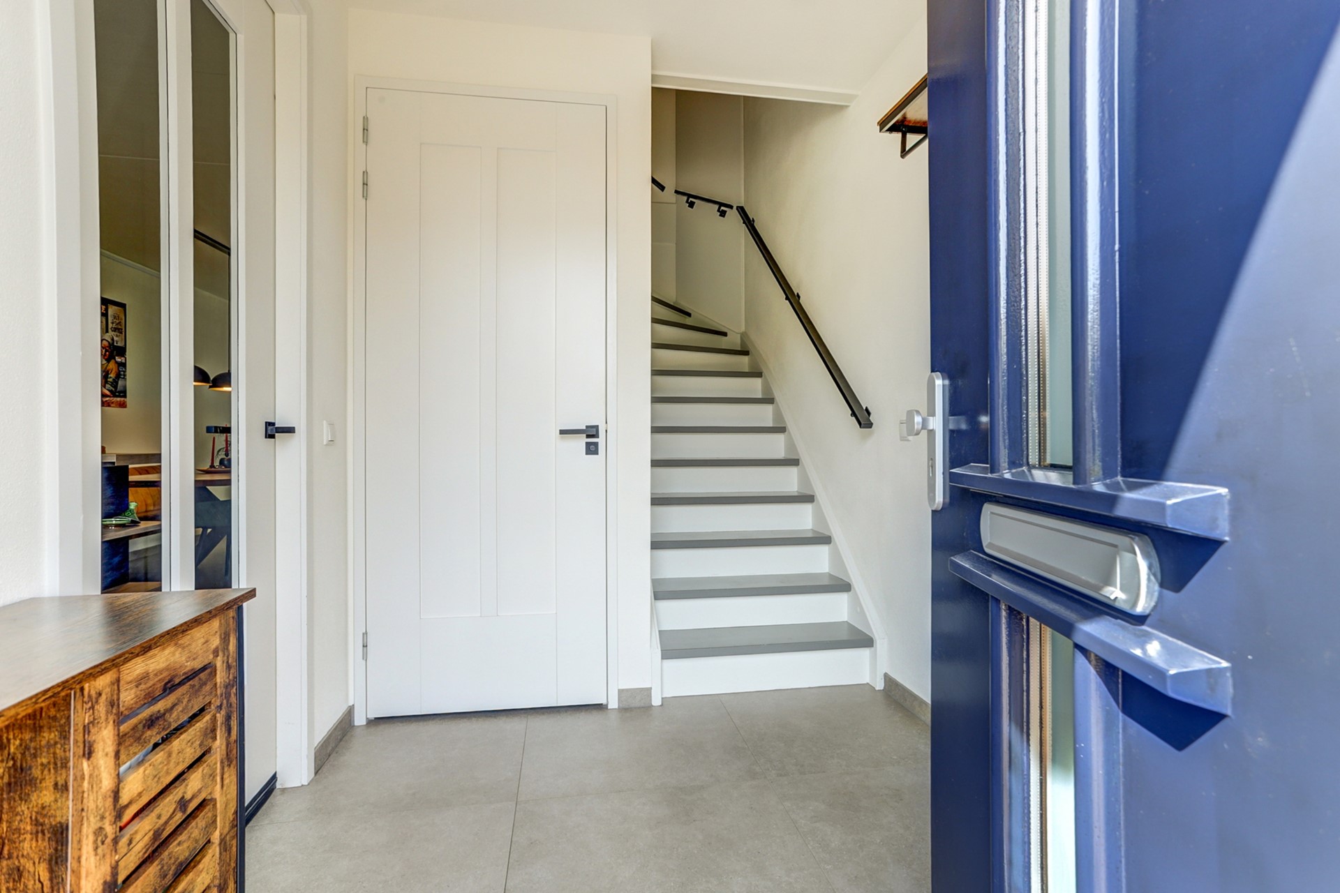 De entreehal is voorzien van een moderne grijze tegelvloer v.v. vloerverwarming, strakke wanden-en plafonds en beschikt over een meterkast en modern toilet v.v. hangcloset en fonteintje. Vanuit de hal heeft u toegang tot de eerste verdieping en keuken.