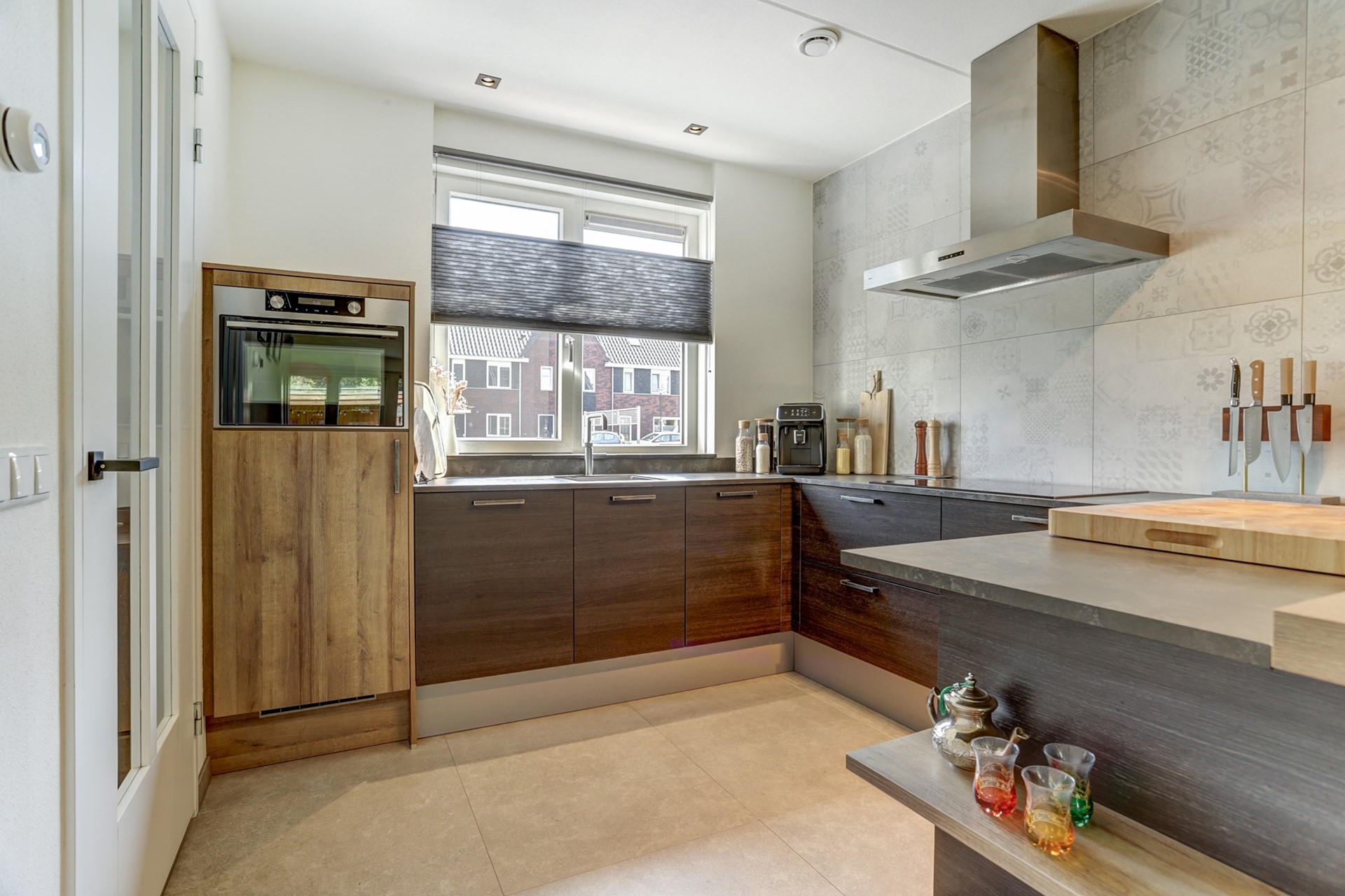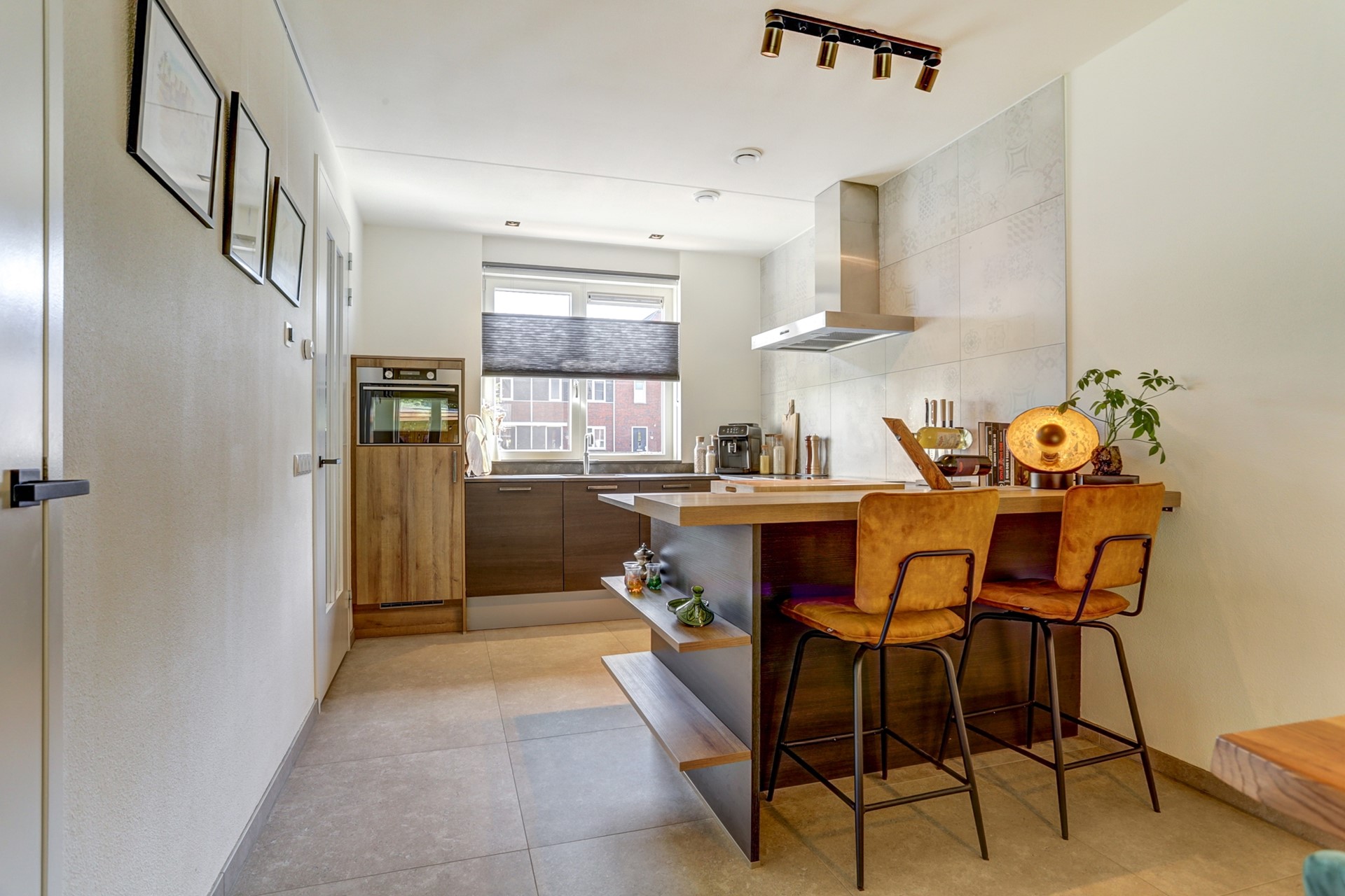 Vanuit de hal krijg je meteen een sneak peek van de keuken, en geloof me: dit is er eentje om verliefd op te worden. Donkere tinten, houtlook en gave wandtegels vormen samen een stijlvolle en warme combinatie. De inbouwkeuken in U-opstelling is royaal opgezet en biedt volop werkruimte. Alles is aanwezig: een inductiekookplaat, koelkast, vaatwasser, afzuigkap én een Quooker.