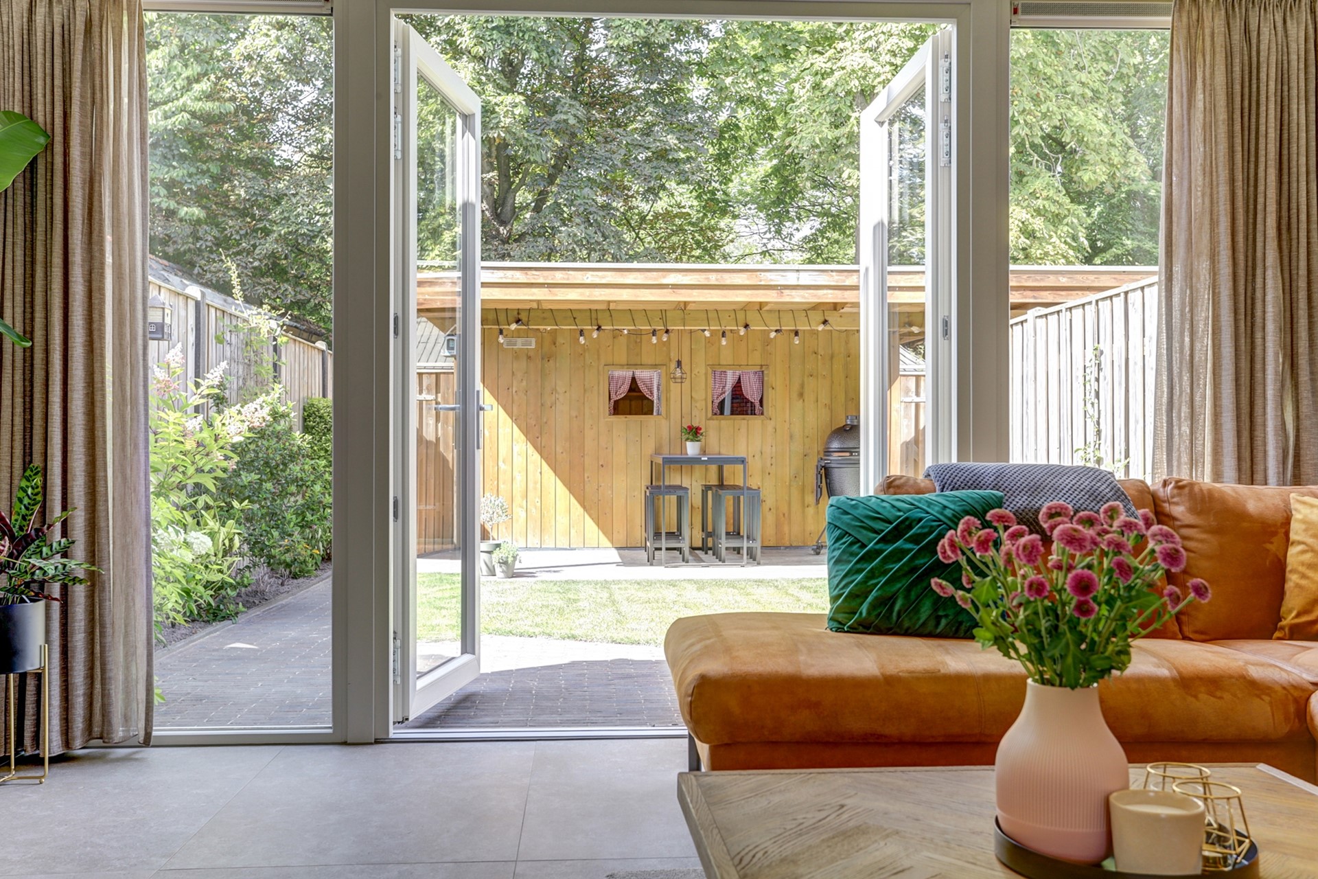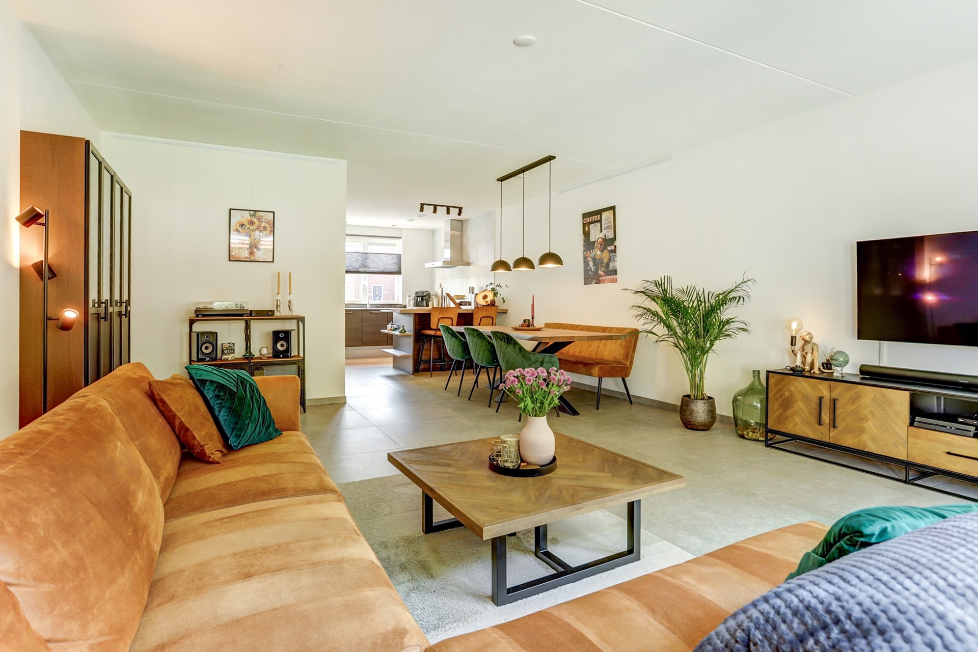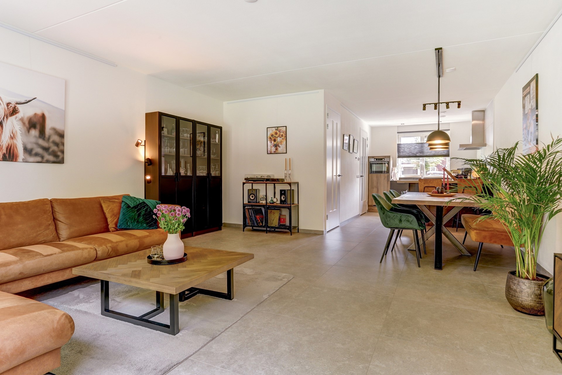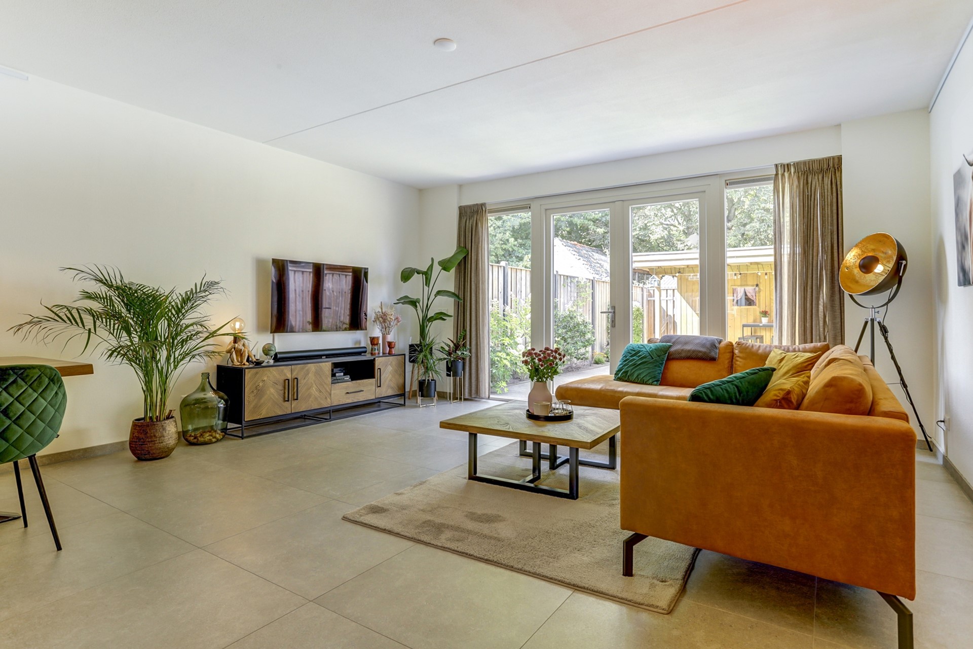 Sfeervolle, ruim opgezette woonkamer met een moderne tegelvloer voorzien van vloerverwarming. Het zitgedeelte aan de achterzijde biedt volop ruimte voor een royale hoekbank, een heerlijke relaxfauteuil én een fraai uitzicht op de achtertuin. Dankzij de grote ramen en dubbele tuindeuren stroomt het daglicht rijkelijk naar binnen en ontstaat er een directe verbinding met buiten.