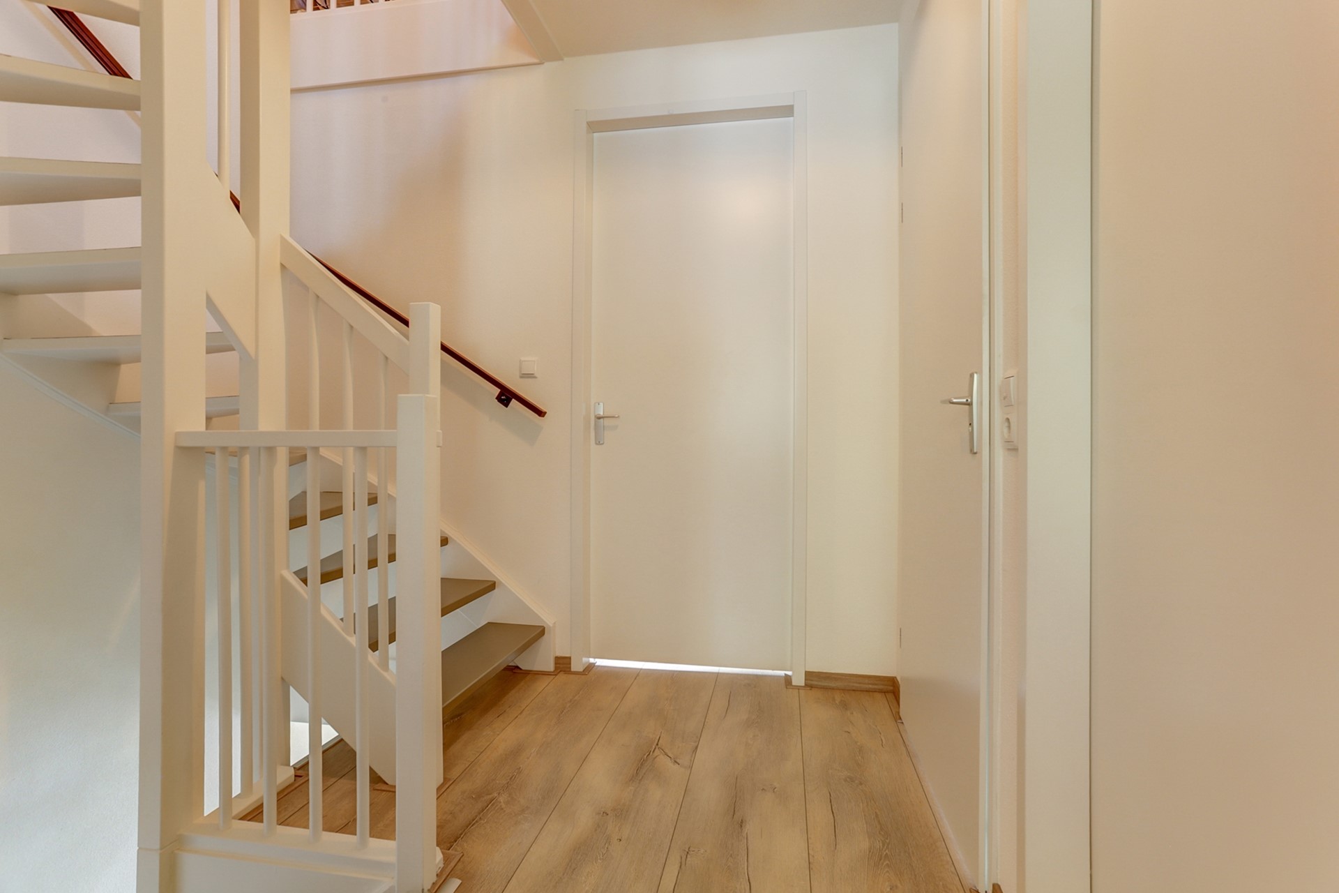 De ruime overloop geeft toegang tot twee slaapkamers, moderne badkamer en een vaste trap naar tweede verdieping. De gehele verdieping is voorzien van een fraaie (extra brede) laminaatvloer, strakke wanden en plafonds.