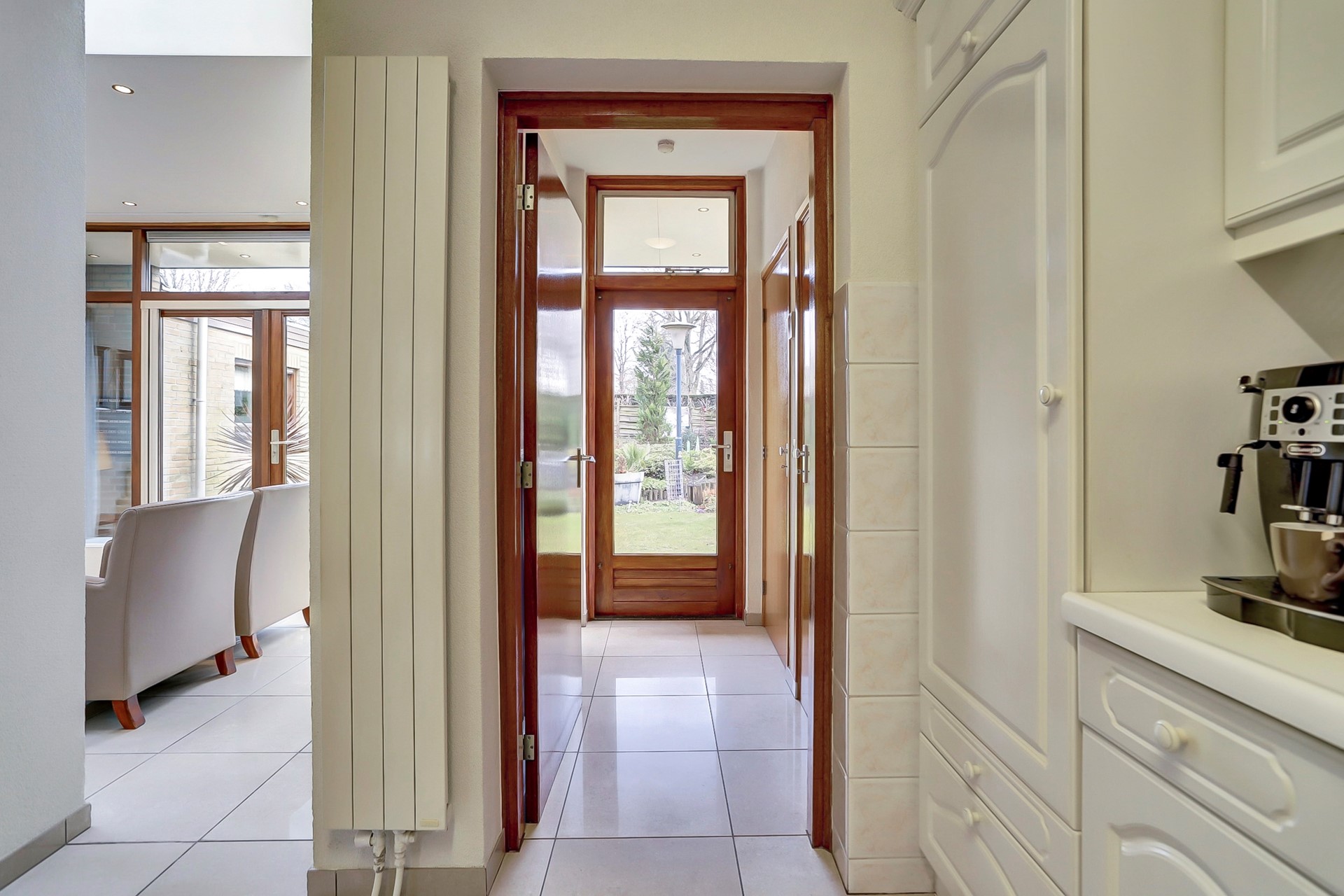 Daarnaast is er vanuit de keuken directe toegang tot het achterportaal, waar je twee handige inbouwkasten en de achterdeur naar de achtertuin kunt vinden.