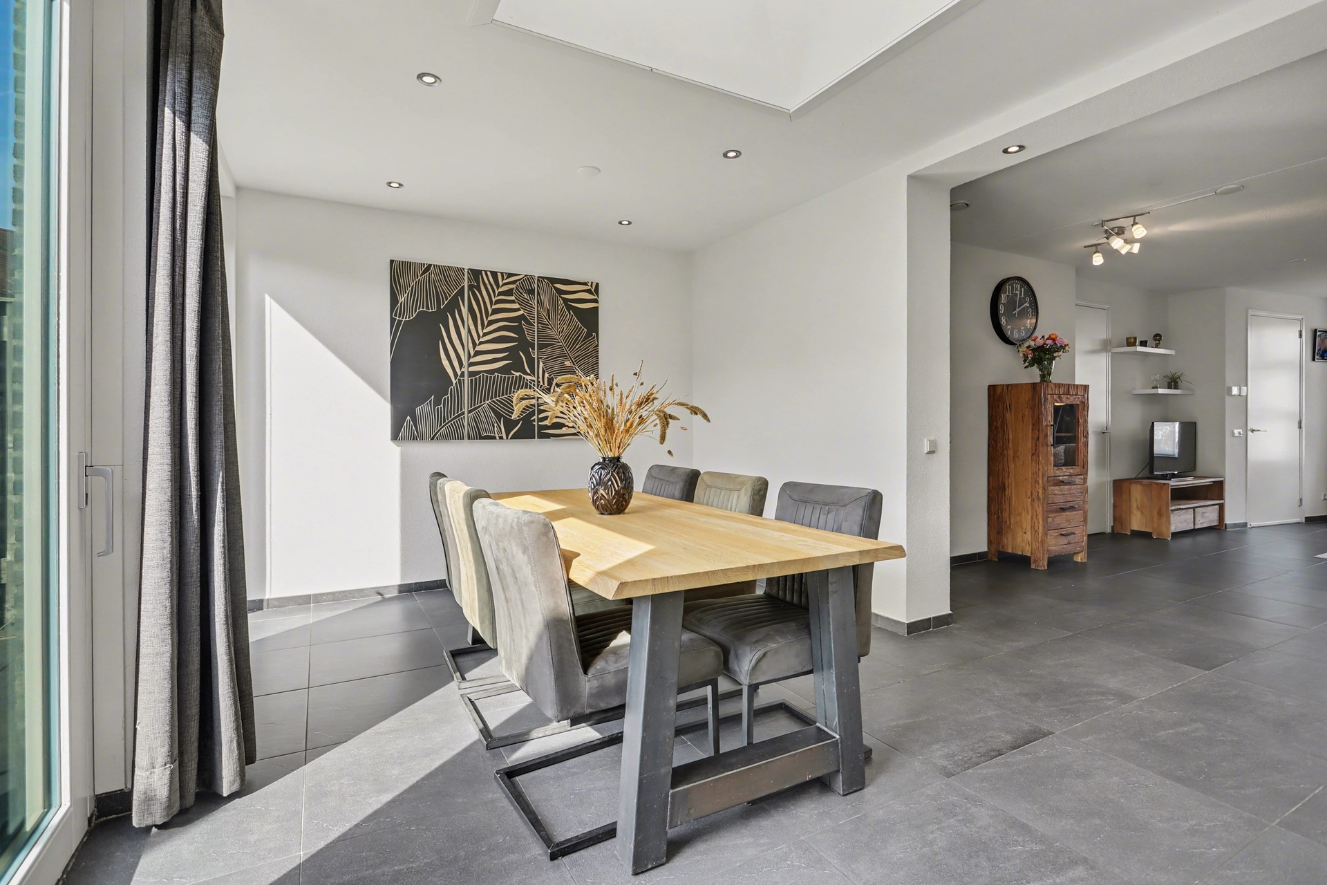 De lichtkoepel, brede schuifpui, extra loopdeur en subtiele inbouwspots zorgen voor een bijzonder lichte en uitnodigende eetruimte. Of je nu uitgebreid dineert, rustig een kop koffie drinkt in de ochtendzon of een gezellige avond met vrienden hebt, dit is een plek waar je graag bent!
