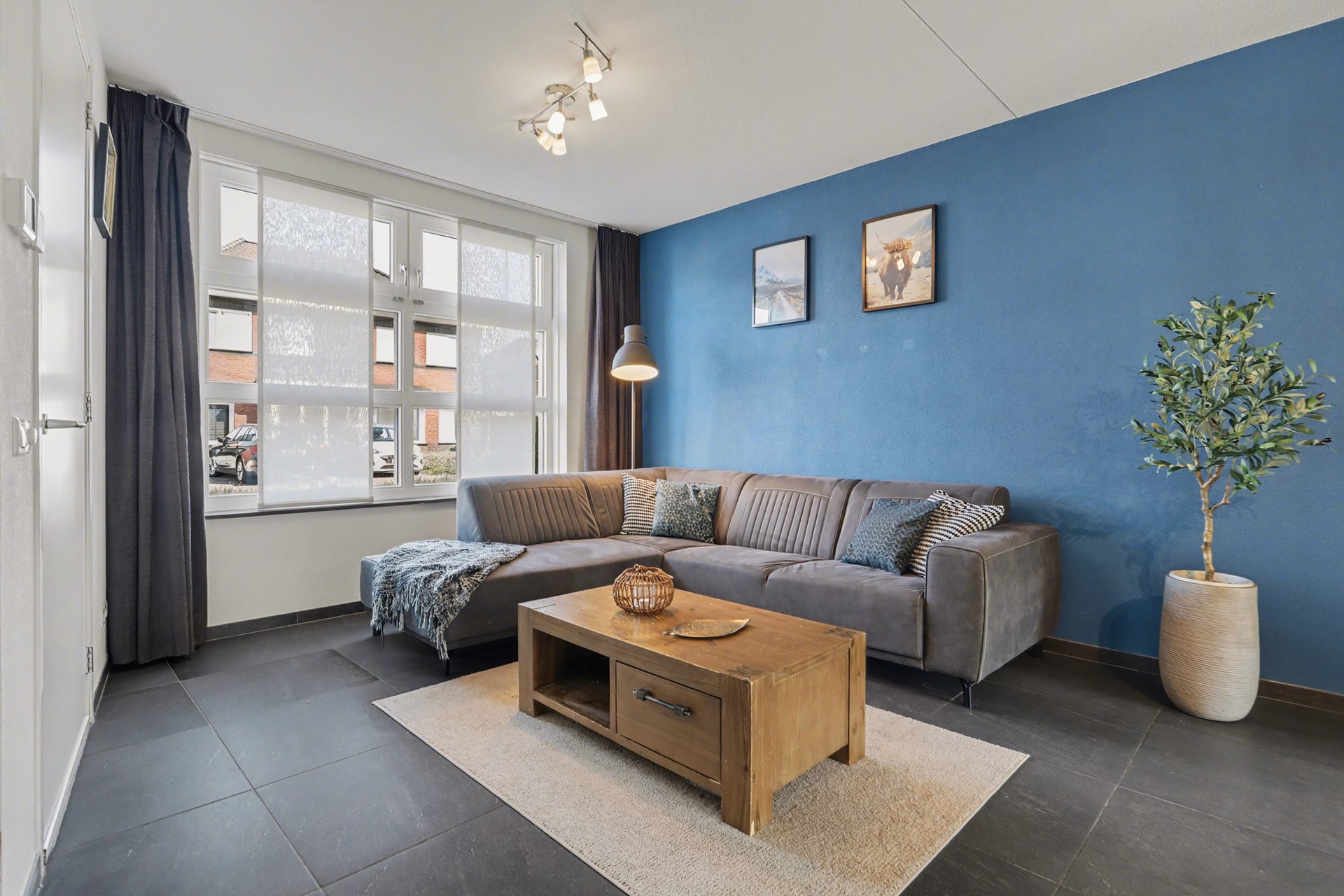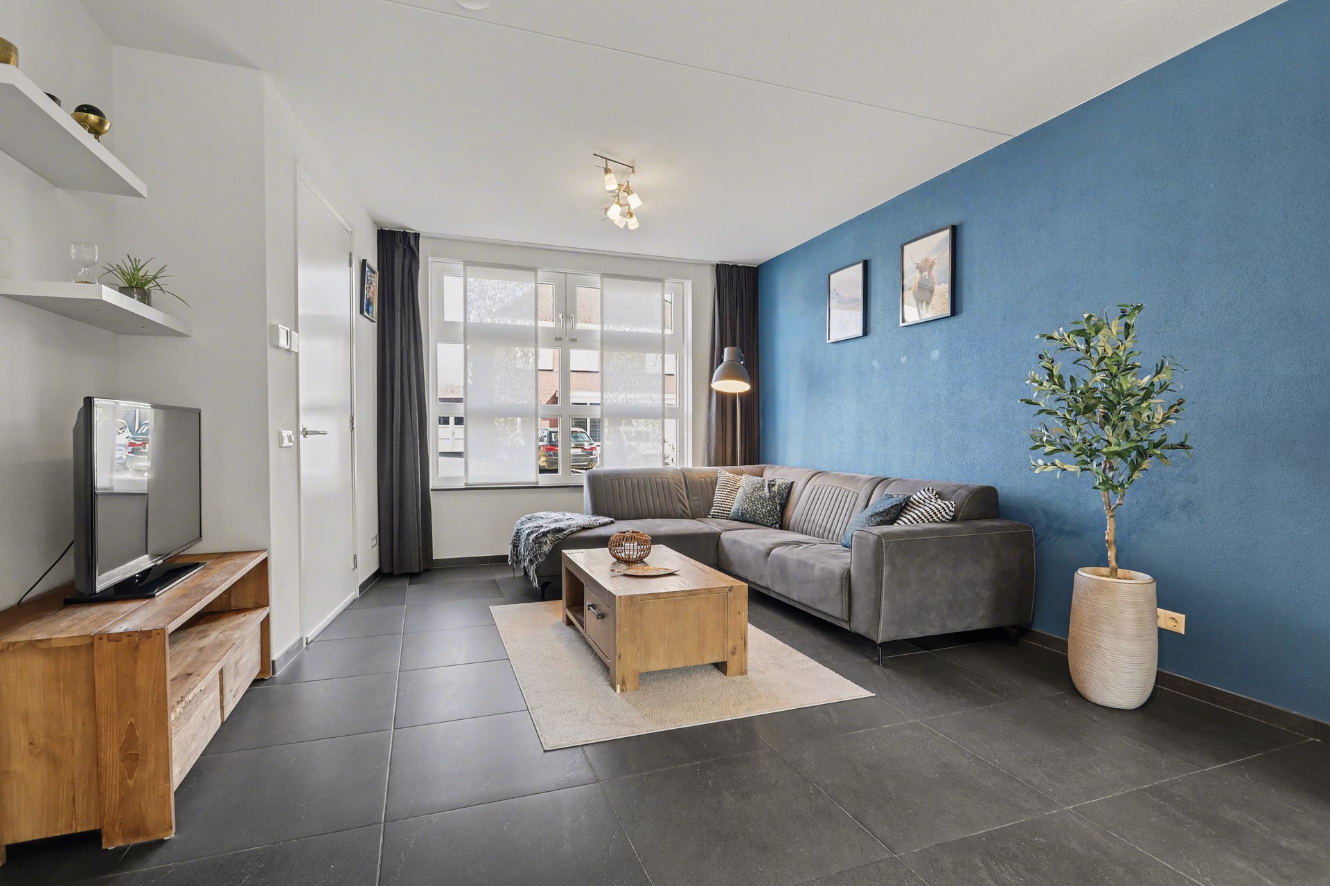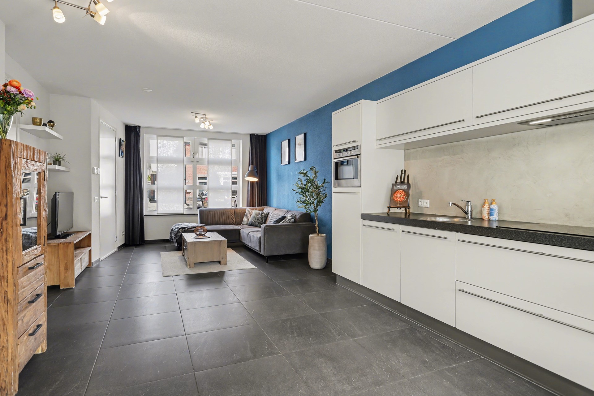 De begane grond is afgewerkt met een stijlvolle antracietkleurige tegelvloer, gecombineerd met comfortabele vloerverwarming. De wanden zijn voorzien van spachtelputz en het plafond is strak afgewerkt met spuitwerk. Dit zorgt voor een rustige en verzorgde uitstraling.