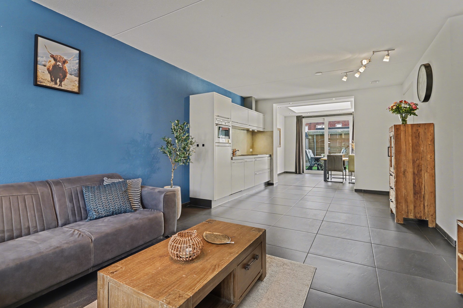 Aan de voorzijde van de woning bevindt zich de sfeervolle woonkamer. Grote raampartijen zorgen hier voor een prachtige lichtinval en een fijne, open sfeer. Een heerlijke plek om te ontspannen na een lange dag of gezellig samen te zijn. De praktische trapkast biedt daarnaast extra bergruimte.