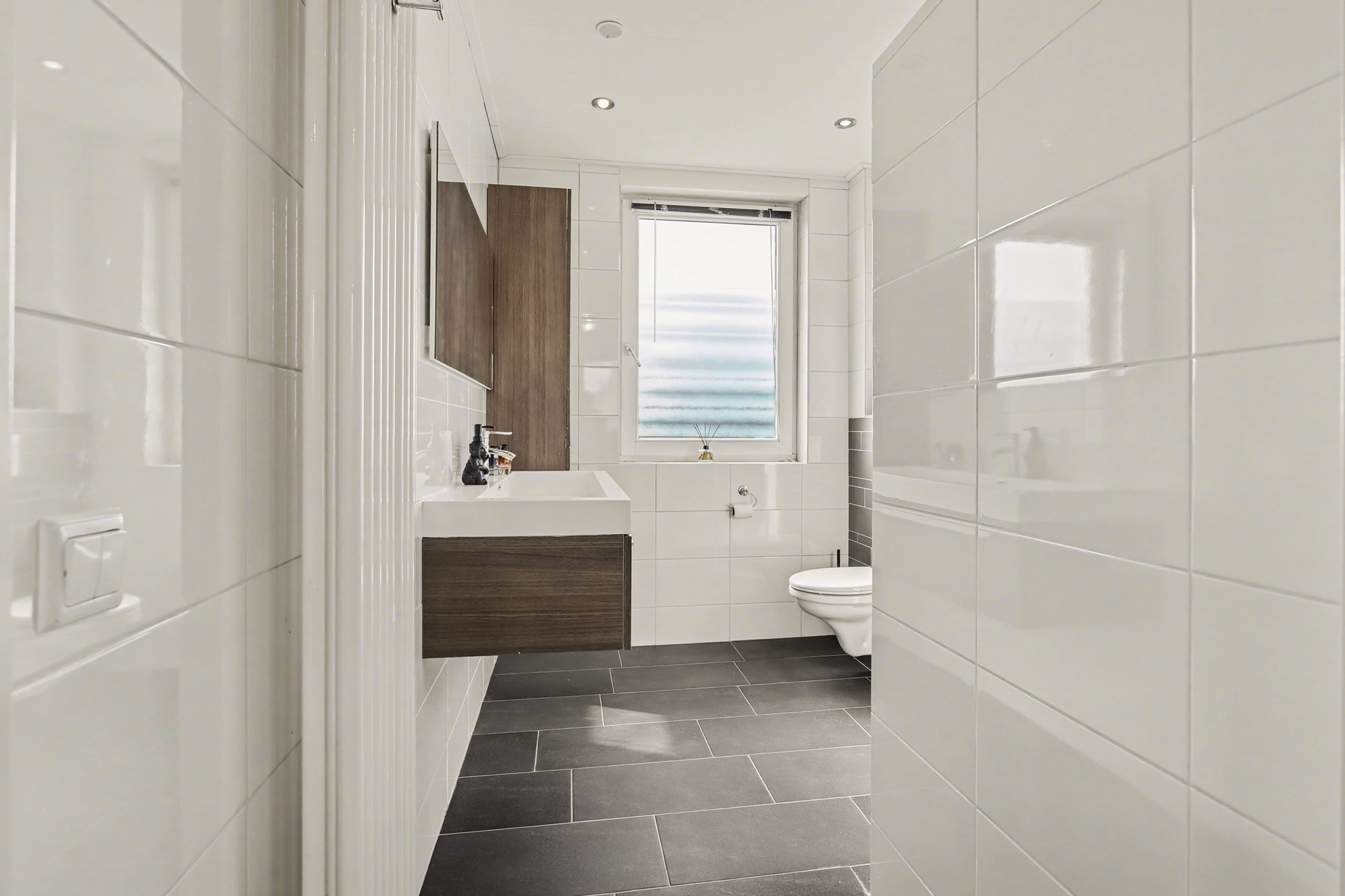 De badkamer is modern en compleet uitgevoerd en vormt een echte blikvanger. Met antraciet vloertegels, witte wandtegels en een doordachte indeling straalt deze ruimte rust en luxe uit. Je beschikt hier over een inloopdouche met glazen deuren, een wandcloset, een stijlvol badmeubel met wastafel en spiegel, een designradiator en een praktische bergkast. Het raam zorgt voor extra daglicht en ventilatie.