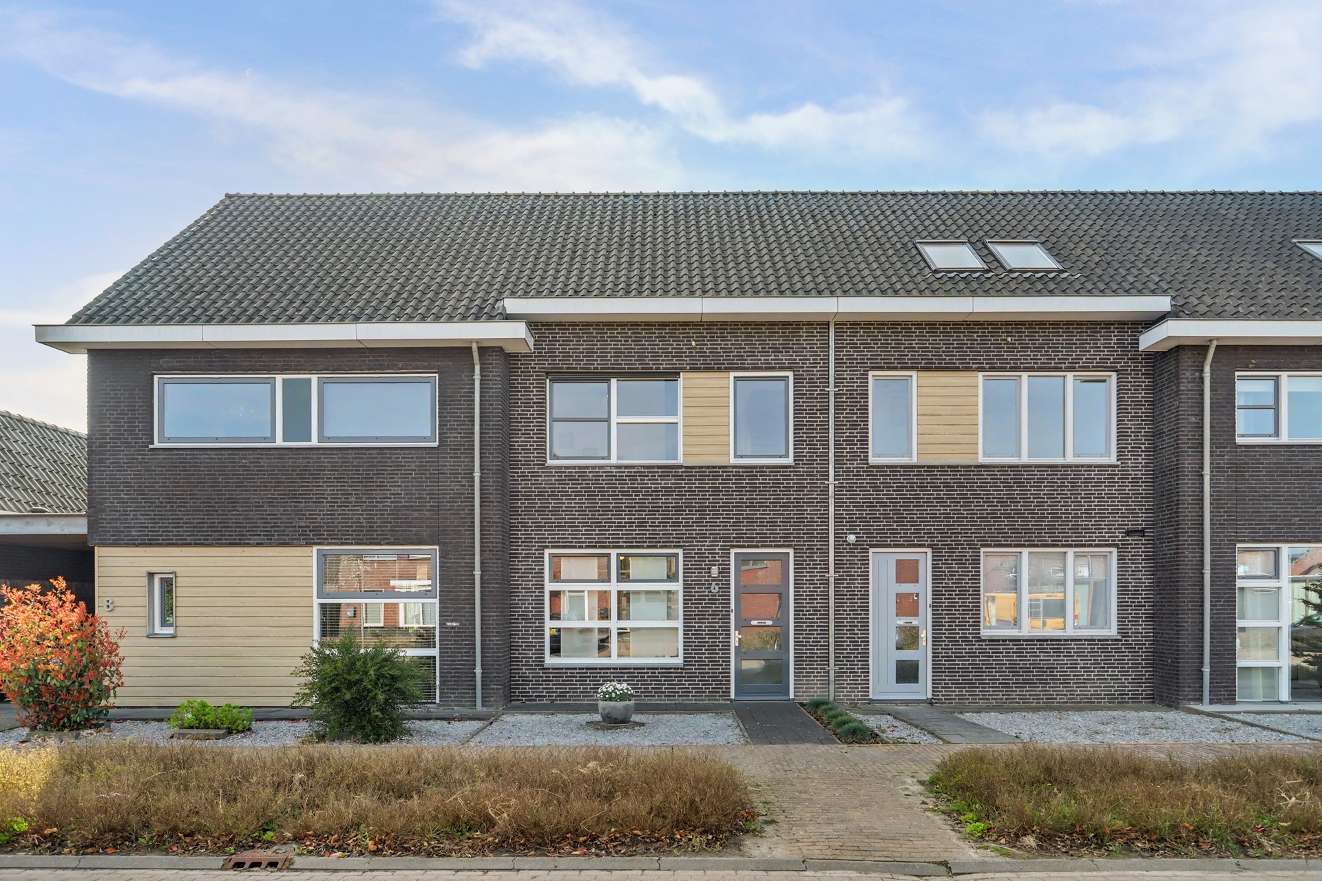 De voortuin is onderhoudsvriendelijk ingericht met een pad naar de voordeur, kiezels en een groene plantenborder.