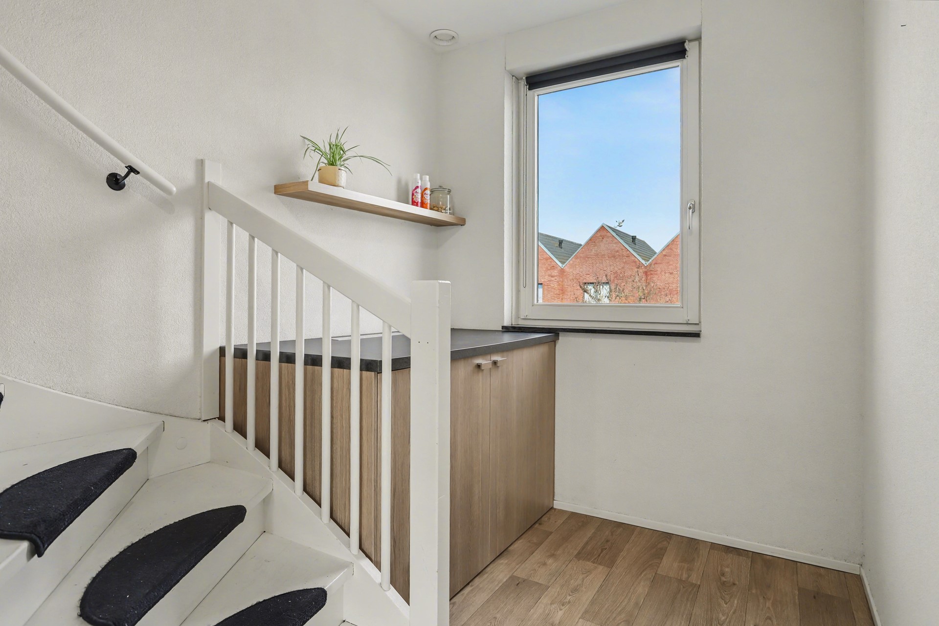 De verdieping is netjes afgewerkt met een linoleumvloer, spachtelputz wanden en strak spuitwerk op het plafond. Hardhouten kozijnen met HR++ beglazing en draai-kiepramen zorgen voor comfort en goede isolatie. Op de overloop vind je een slimme wasopstelling voor wasmachine en droger, stijlvol weggewerkt in een praktische ombouwkast met werkblad – ideaal om de was netjes te organiseren.