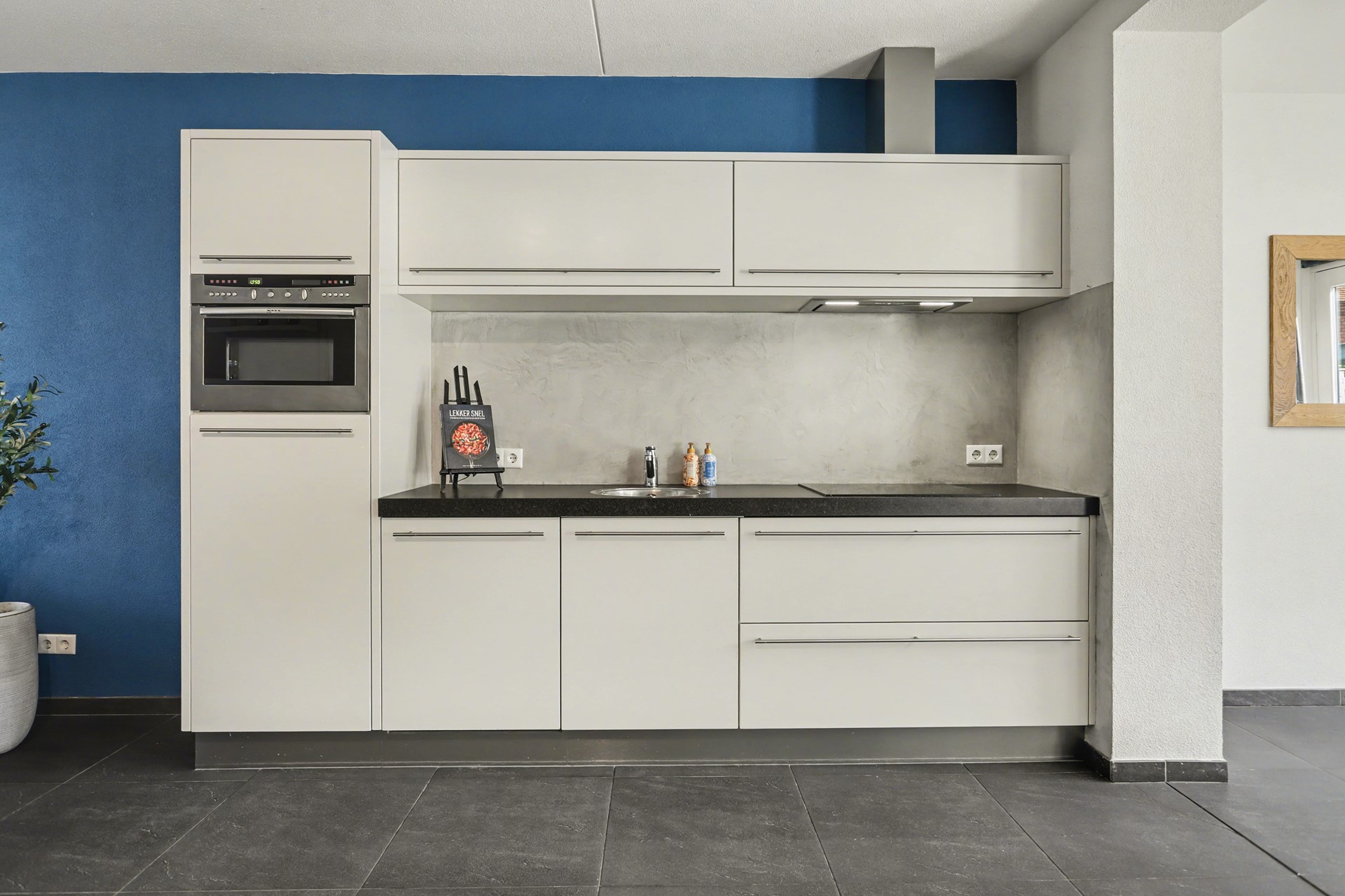 De keuken is voorzien van diverse inbouwapparatuur, waaronder een inductiekookplaat, combimagnetron, afzuigkap en koelkast. Dankzij de centrale opstelling blijf je altijd in contact met de rest van de ruimte – ideaal tijdens het koken of wanneer je gasten ontvangt.