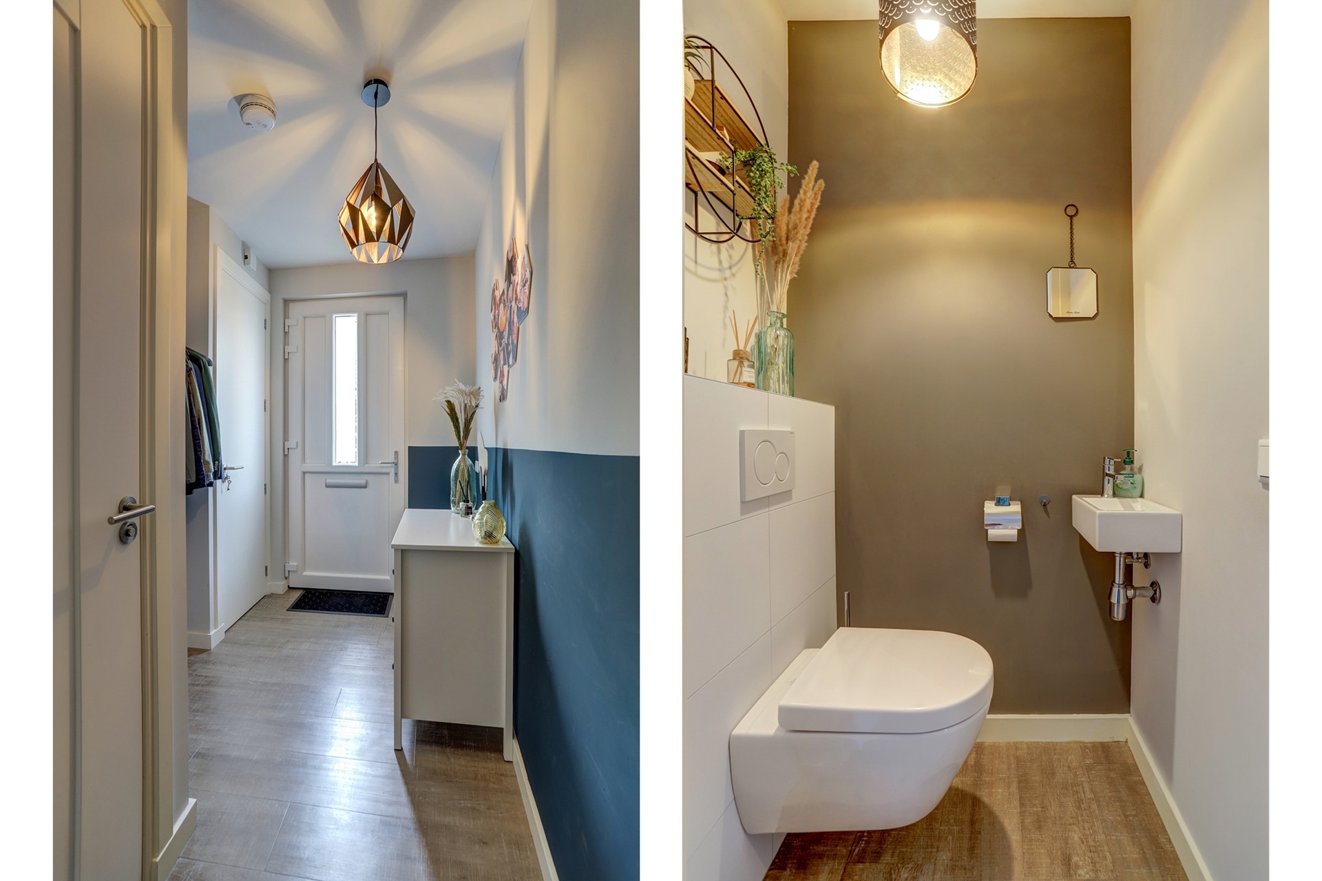 Welkom binnen, de entreehal is voorzien van een moderne pvc- vloer in houtlook motief, stucwerk op wanden en plafond. De hal biedt toegang tot het toilet met hangcloset en fonteintje, meterkast, garderobenis, trapopgang naar de eerste verdieping en de woonkamer.