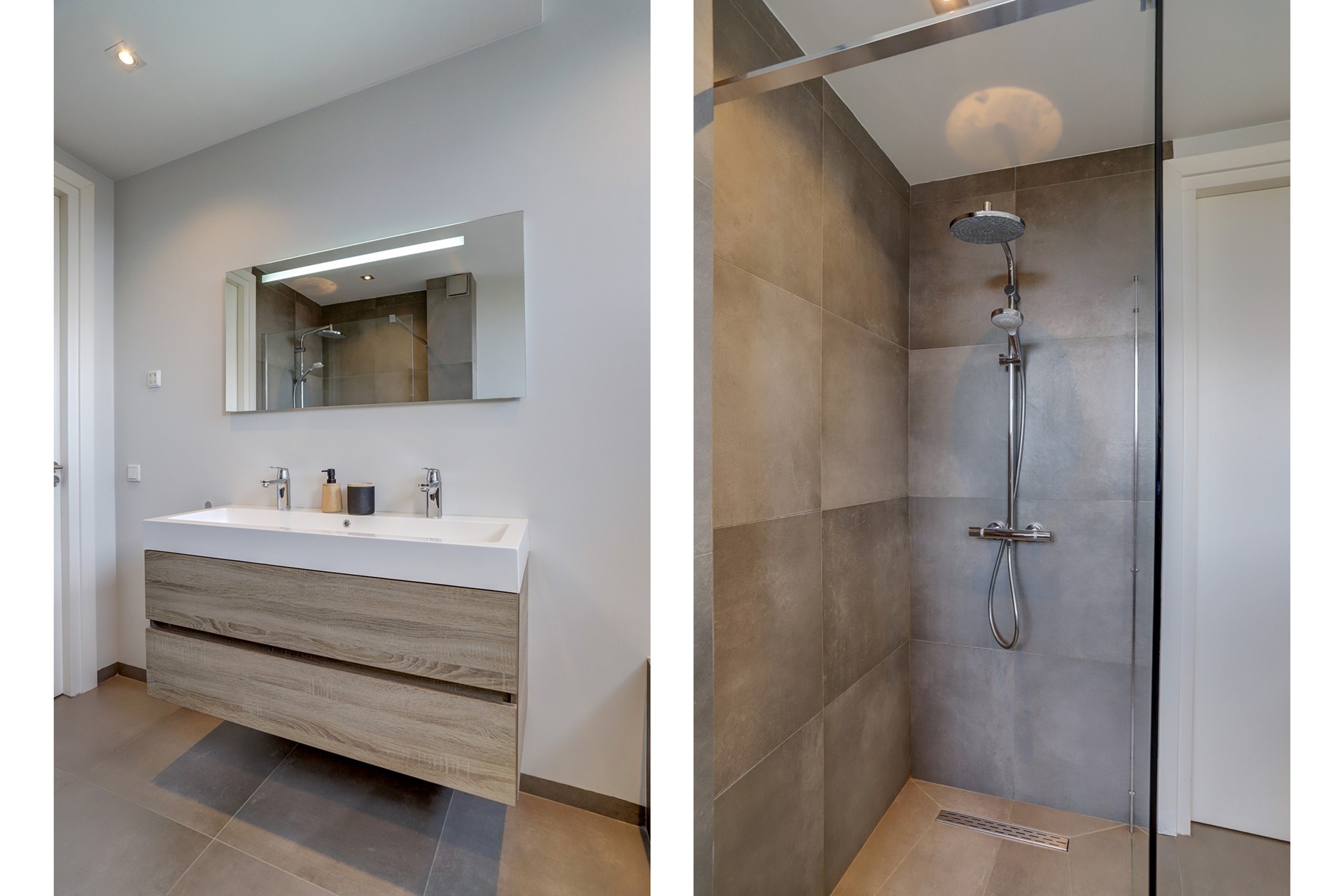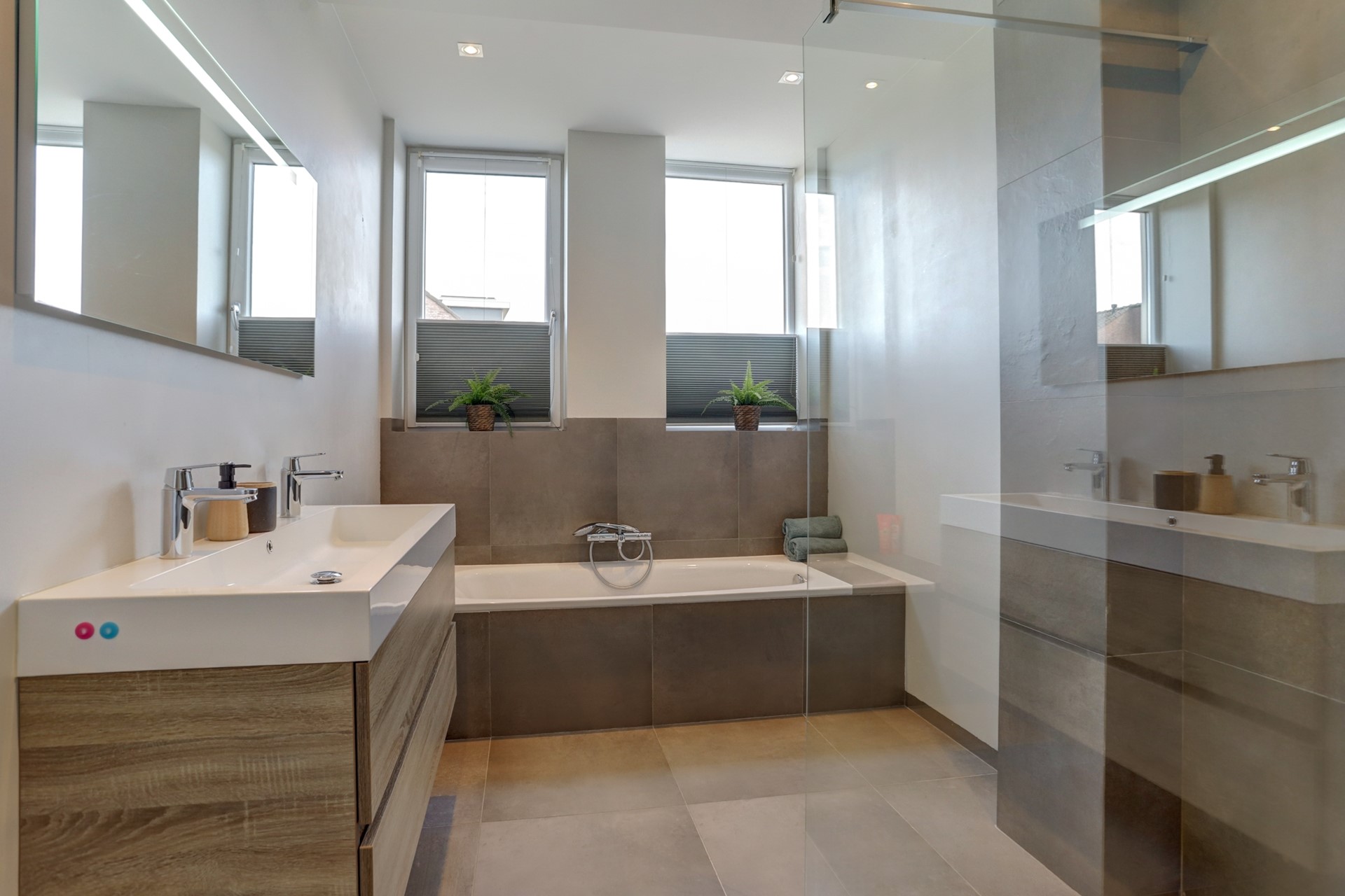 Moderne badkamer die deels betegeld is en deels voorzien is van stucwerk. De badkamer beschikt over een royale inloopdouche met glazen scheidingswand, ruim ingebouwd ligbad en een badmeubel met wastafel en dubbele kranen. Door de dakkapel is deze ruimte extra licht en zorgt voor voldoende ventilatie.
