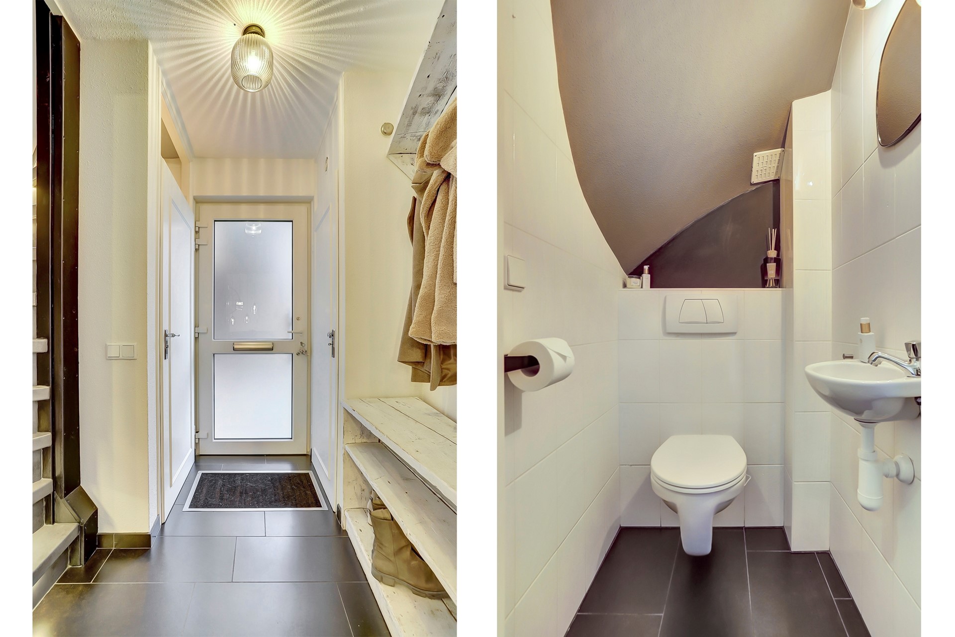 Aan de rechterzijde van de woning bereik je via de oprit de voordeur. Eenmaal binnengekomen betreed je de entreehal, welke is afgewerkt met een antracietkleurige tegelvloer, gestuukte wanden en spuitwerk plafond. Vanuit de hal heb je toegang tot de meterkast, het toilet en de vaste trapopgang naar de eerste verdieping. Het toilet is volledig betegeld en voorzien van een hangcloset en fonteintje.