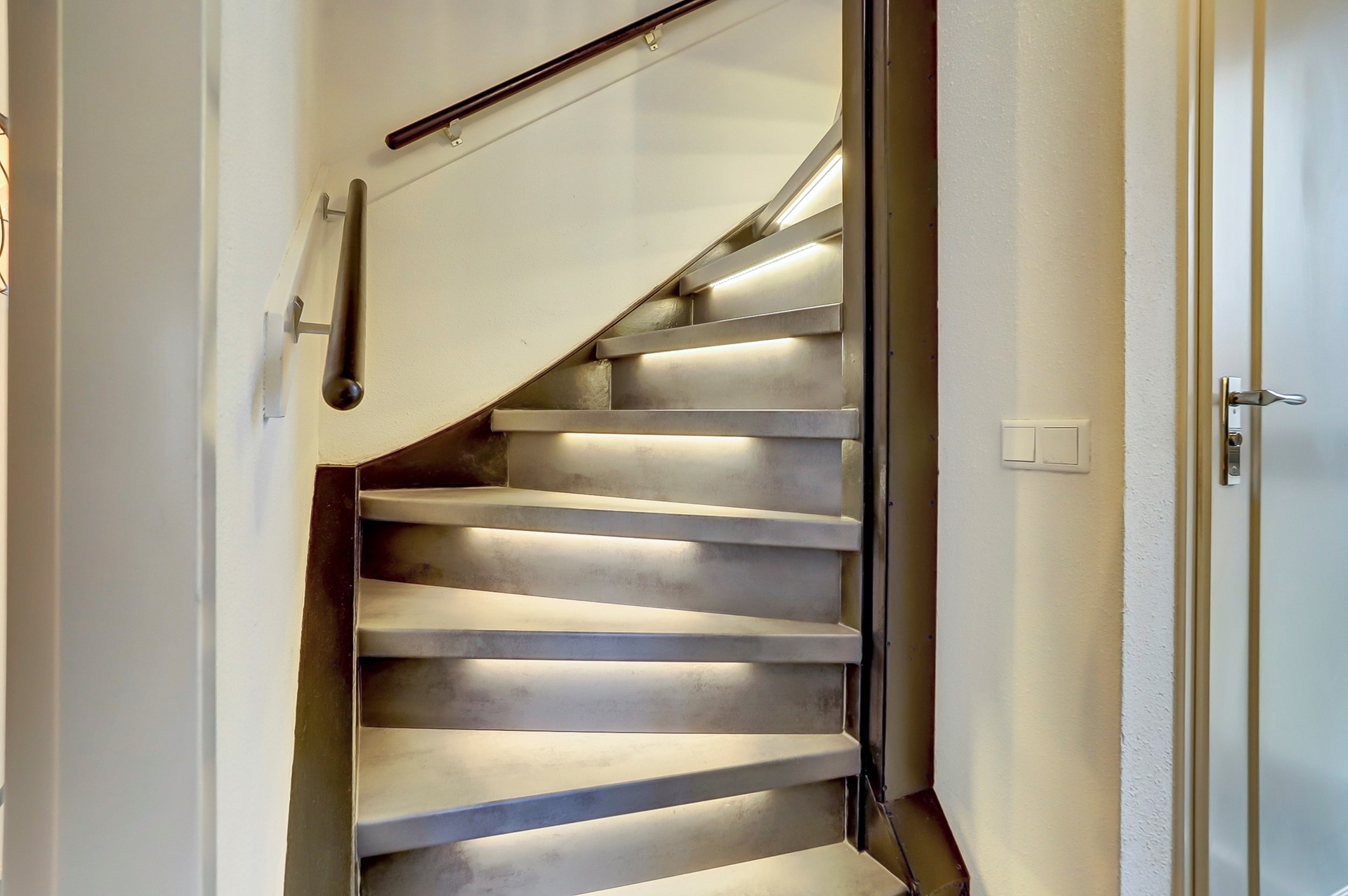 De trap naar boven is afgewerkt met nieuwe lichtgrijze overzettreden en voorzien van automatische verlichting die inschakelt zodra je de trap oploopt. Vanuit de hal loop je door naar de woonkamer.