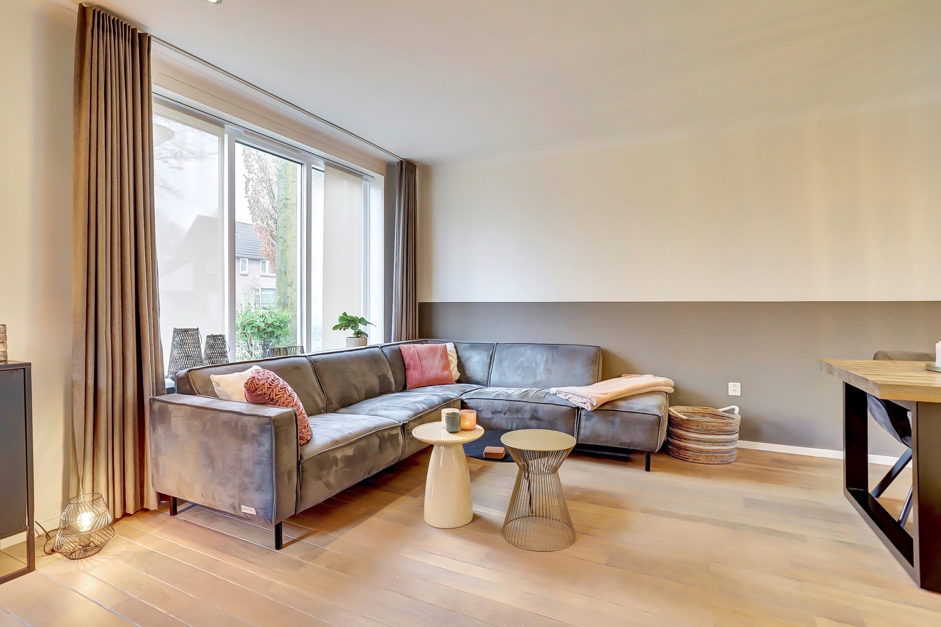 Zodra je de woonkamer binnen loopt, komt het warme en sfeervolle gevoel je direct tegemoet, mede dankzij de prachtige houten vloer. Aan de voorzijde bevindt zich een gezellige zithoek waar de grote raampartijen aan zowel de voor- als zijkant zorgen voor een fijne lichtinval en prettige uitkijk. Een fijne plek om te ontspannen en helemaal tot rust te komen.