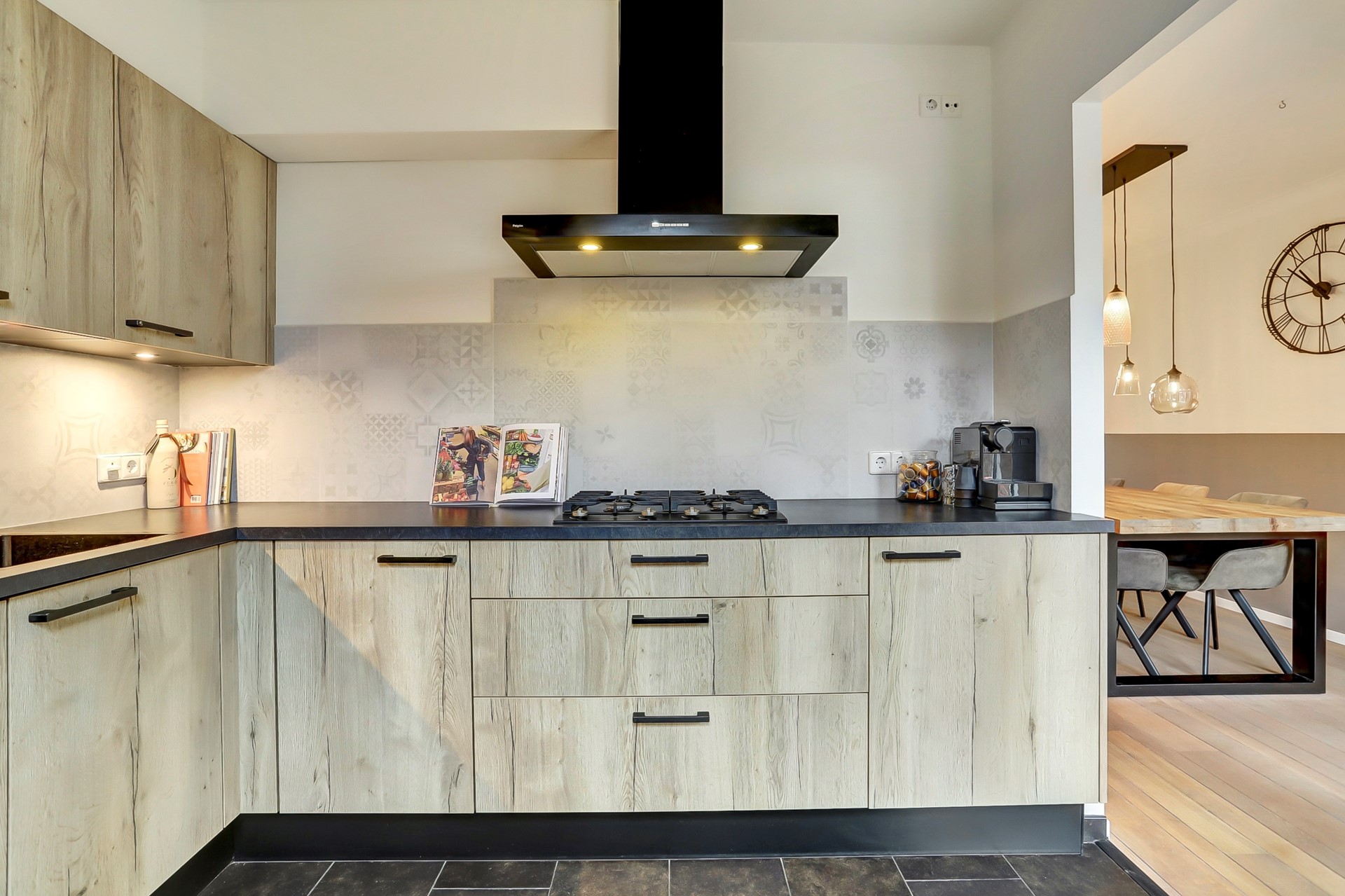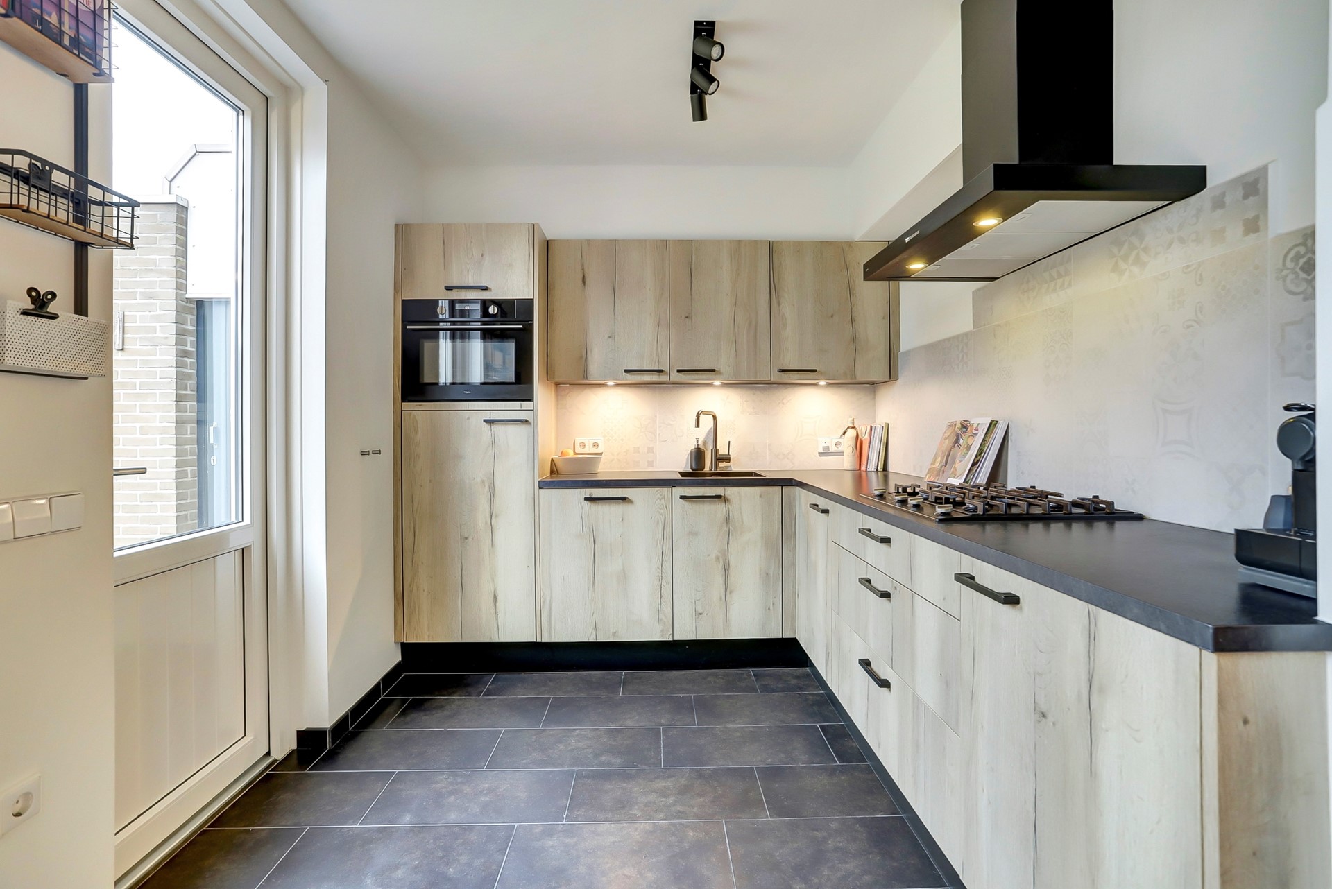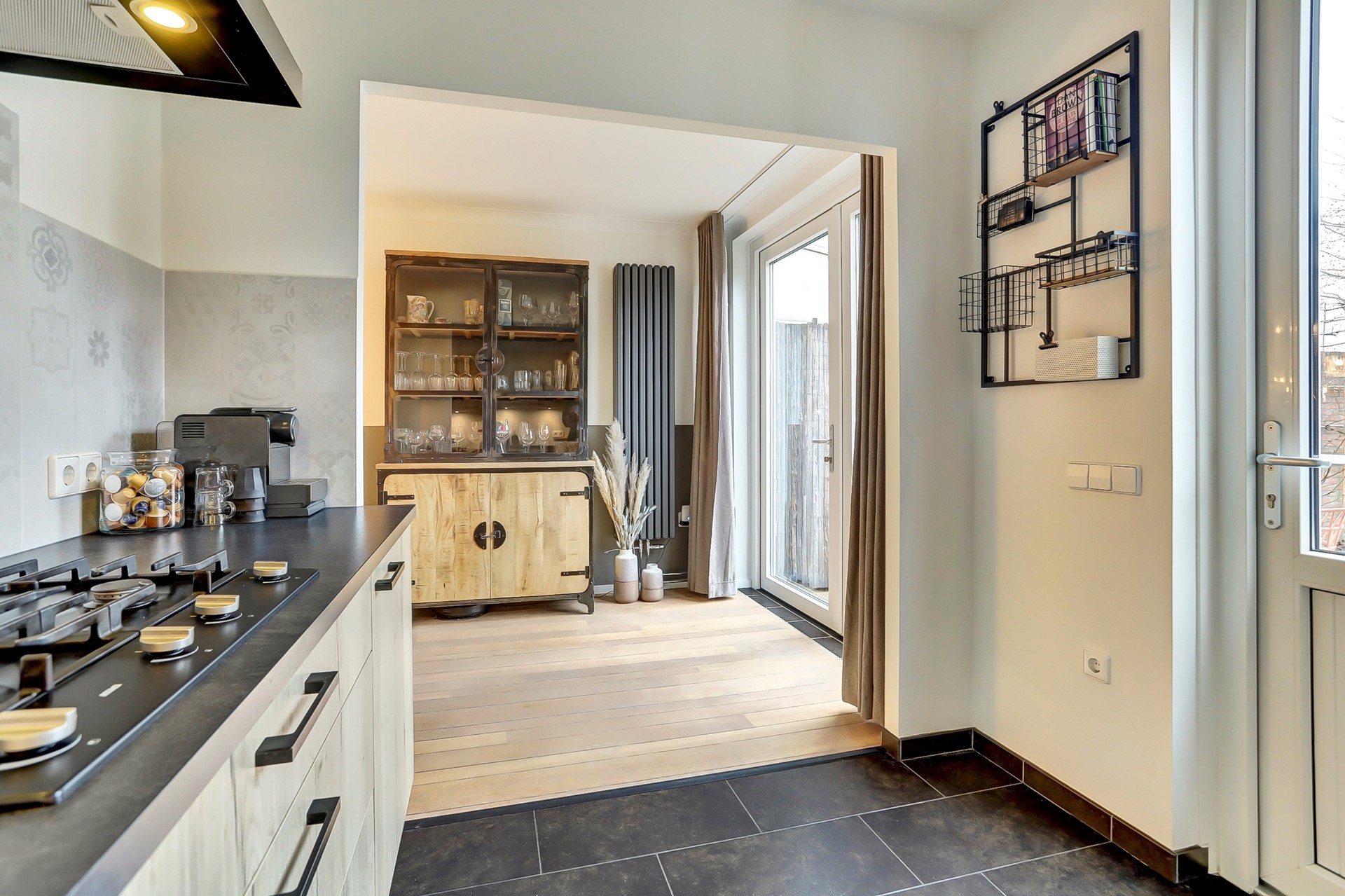 De open keuken (2020)is bereikbaar vanuit de woonkamer en is afgewerkt met een nette tegelvloer, strakke wandafwerking en een verzorgd plafond. De keuken is geplaatst in een praktische hoekopstelling en voorzien van een donkergrijs werkblad met houtlook kastjes. De achterwand is afgewerkt met stijlvolle tegels wat de keuken een moderne uitstraling geeft. Qua apparatuur is de keuken uitgerust met een 4-pits gasfornuis, afzuigkap, spoelbak met mengkraan, combi-oven, koelkast en vaatwasser. Via een loopdeur heb je direct toegang tot de achtertuin.