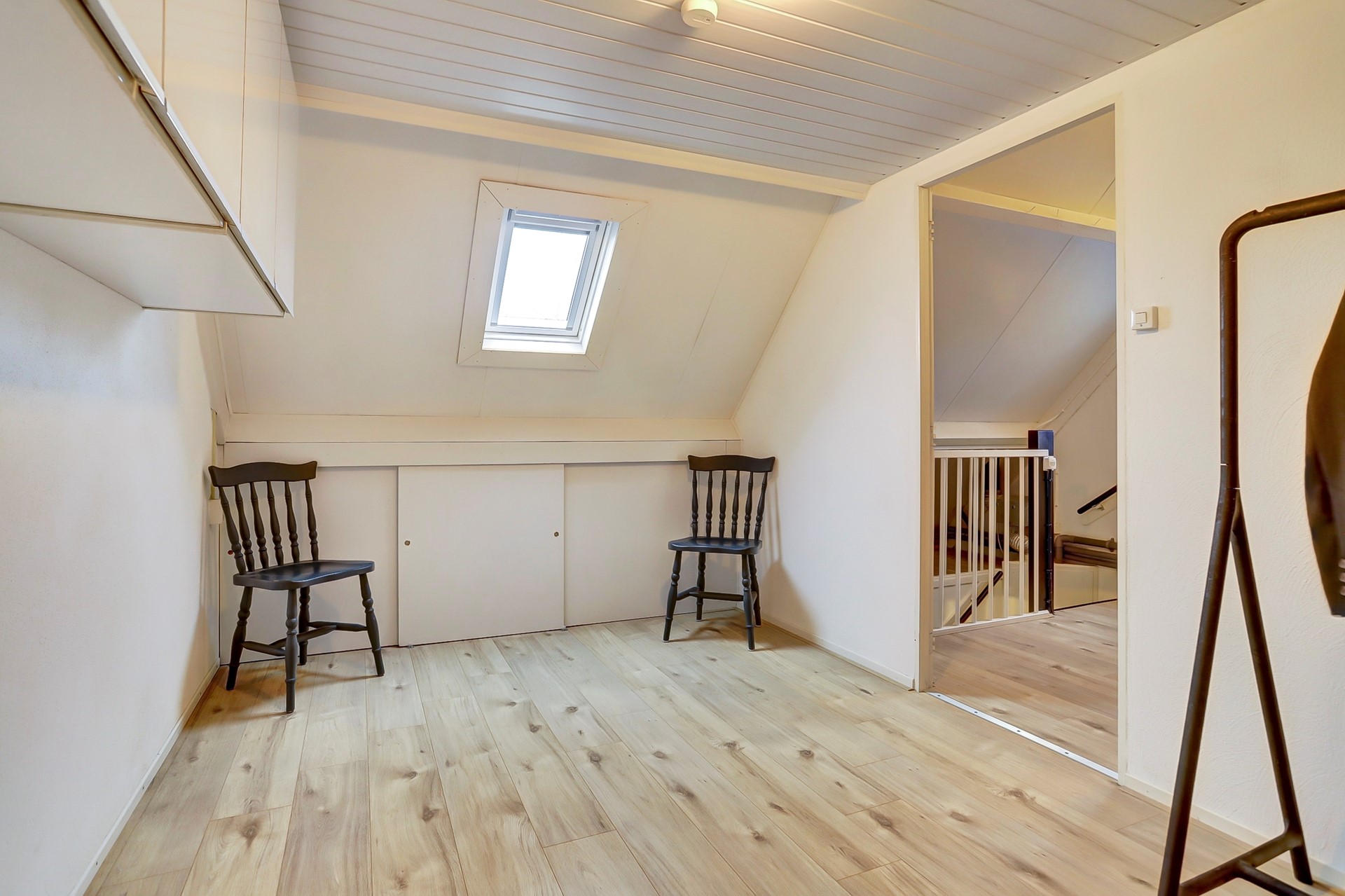 Via een loopdeur bereik je de achterzolder met vliering. Deze ruimte is voorzien van dezelfde laminaatvloer en een neutrale afwerking. Aan beide zijden onder de dakschuinte is praktische bergruimte aanwezig. Het Velux dakraam met verduistering maakt deze ruimte zeer geschikt als extra slaapkamer, hobbyruimte of thuiswerkplek.