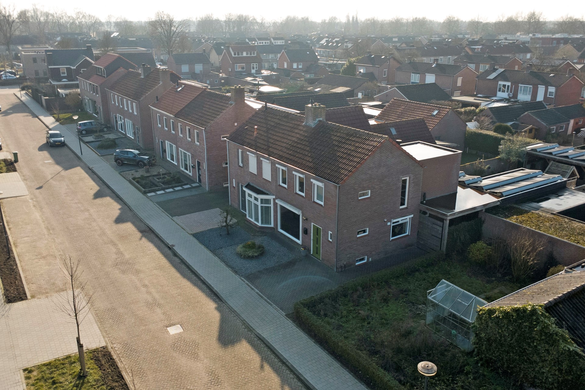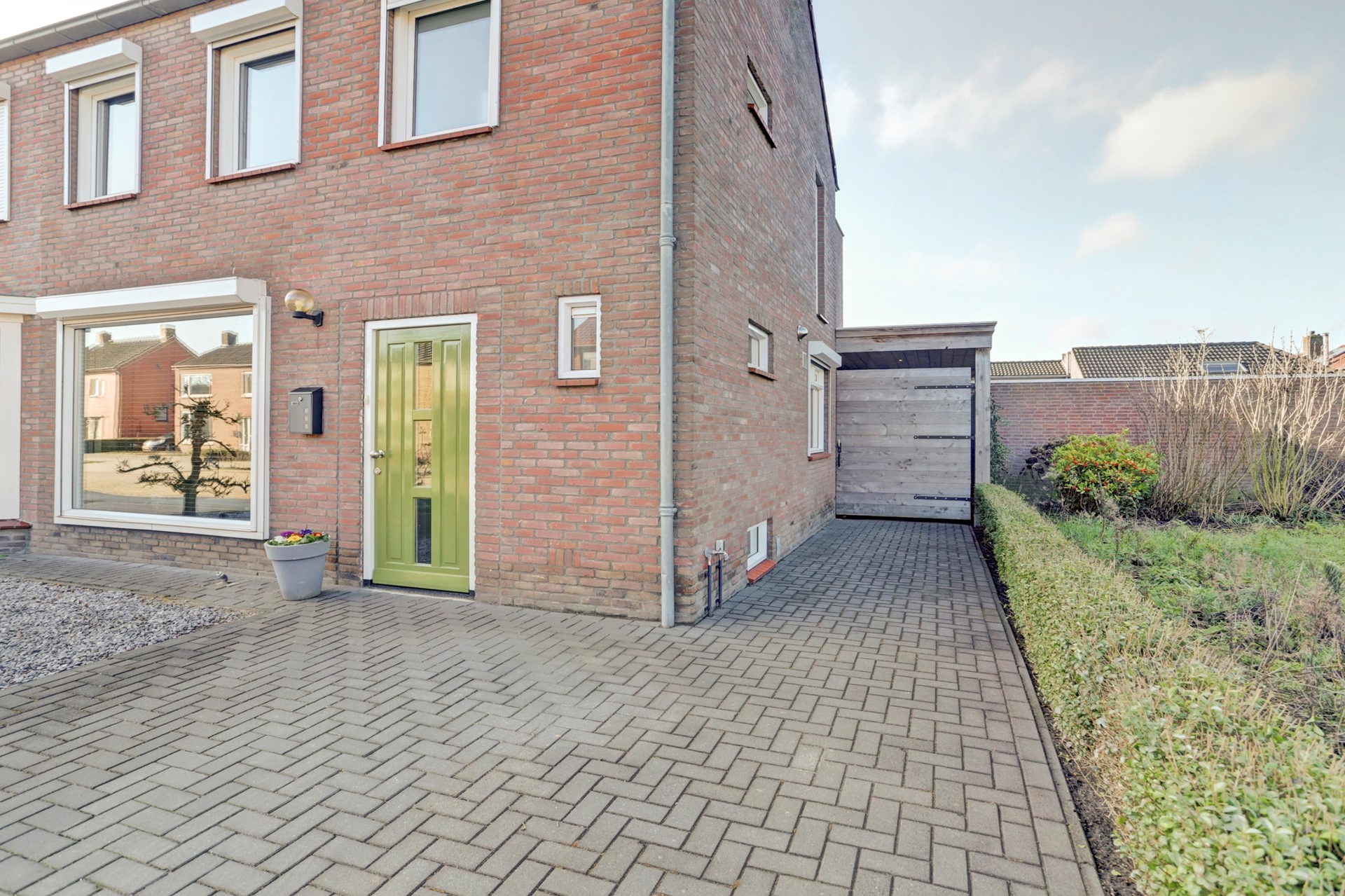 De voortuin is verzorgd aangelegd met nette bestrating en groene plantenborders, wat zorgt voor een rustige en uitnodigende uitstraling. Aan de rechterzijde bevindt zich de eigen oprit met toegang tot de achterom.