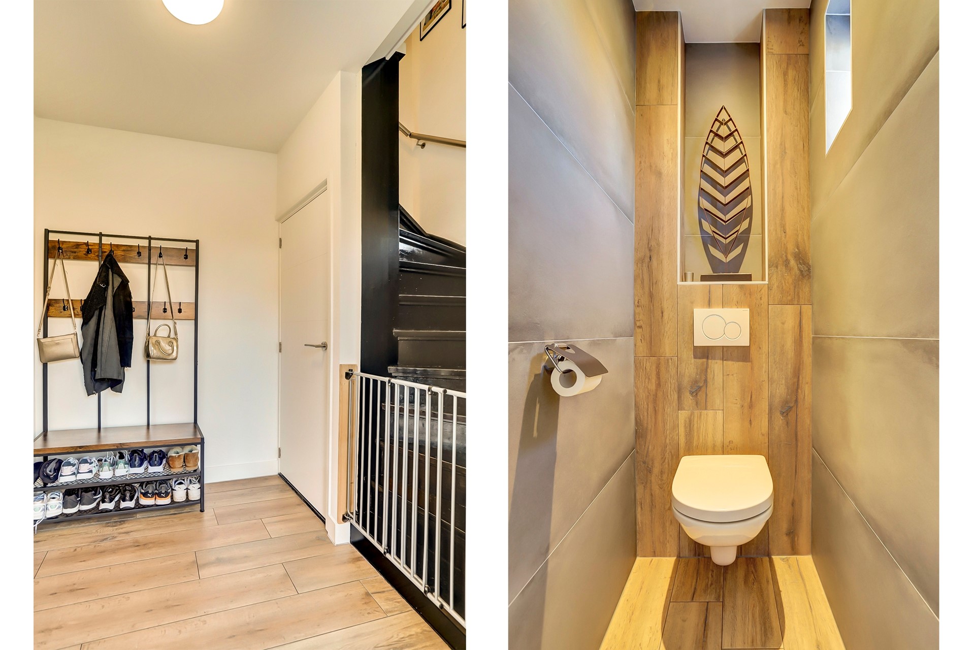 Via de eigen oprit bereik je de voordeur van deze woning. Liever achterom? Rechts langs de woning zit een grote houten poort en bereik je de achtertuin en garage. De entreehal is voorzien van een mooie houtlook tegelvloer met vloerverwarming, gestuukte wanden-en plafonds. De hal beschikt over een vernieuwde meterkast, een handige trapkast en een ruim modern betegeld toilet voorzien van hangcloset. Vanuit de hal heb je toegang tot de eerste verdieping en het woongedeelte.