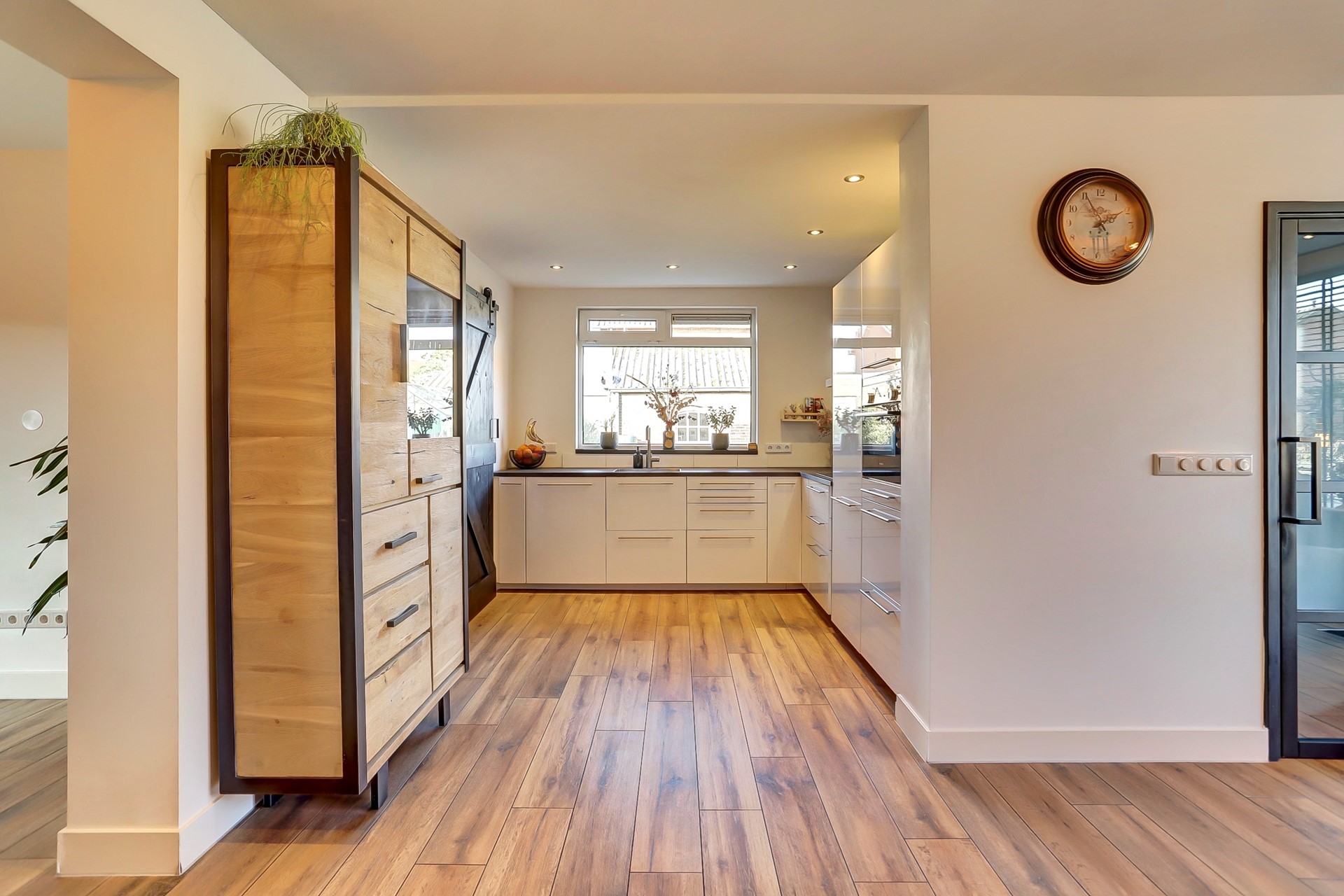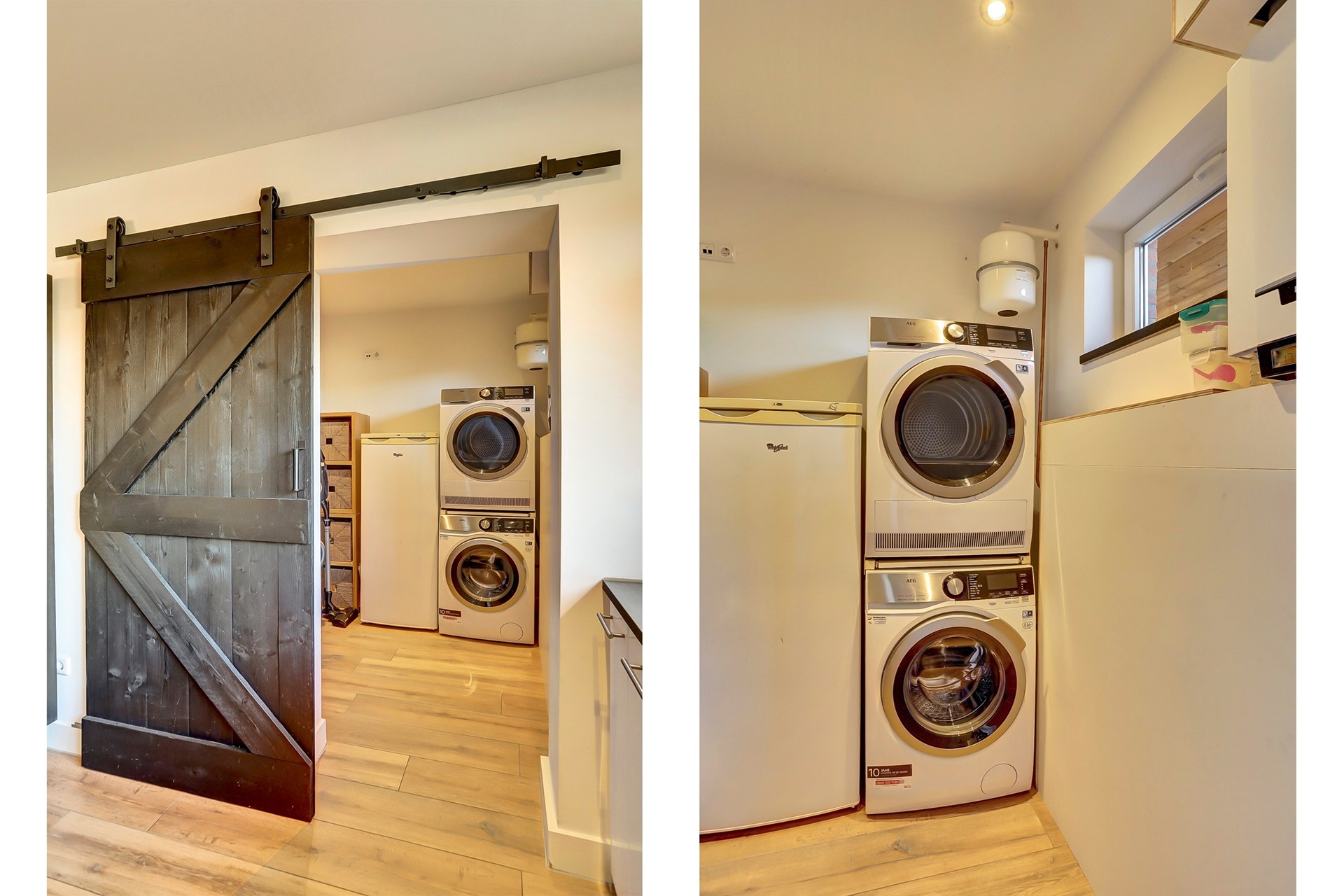 Vanuit de keuken heb je via een schuifdeur toegang tot de bijkeuken. Ook hier is de houtlook tegelvloer doorgelegd. De ruimte beschikt over de witgoedaansluitingen en biedt daarnaast extra ruimte voor bijvoorbeeld een extra koelkast, diepvries of het opbergen van huishoudelijke spullen. Tevens bevindt zich hier de Remeha cv-ketel.