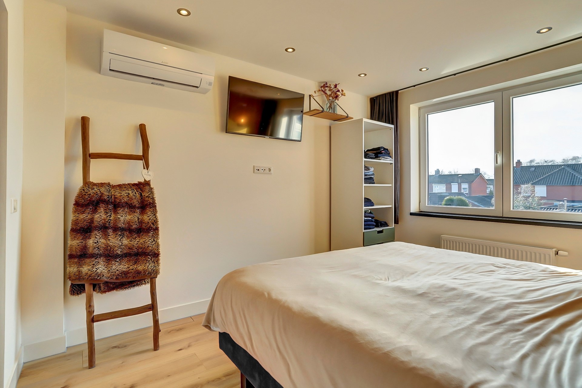 De master bedroom ligt eveneens aan de achterzijde, boven de uitbouw en is de grootste slaapkamer van de woning. Deze slaapkamer beschikt nog over een airco en geeft een prachtig uitzicht op de achtertuin.