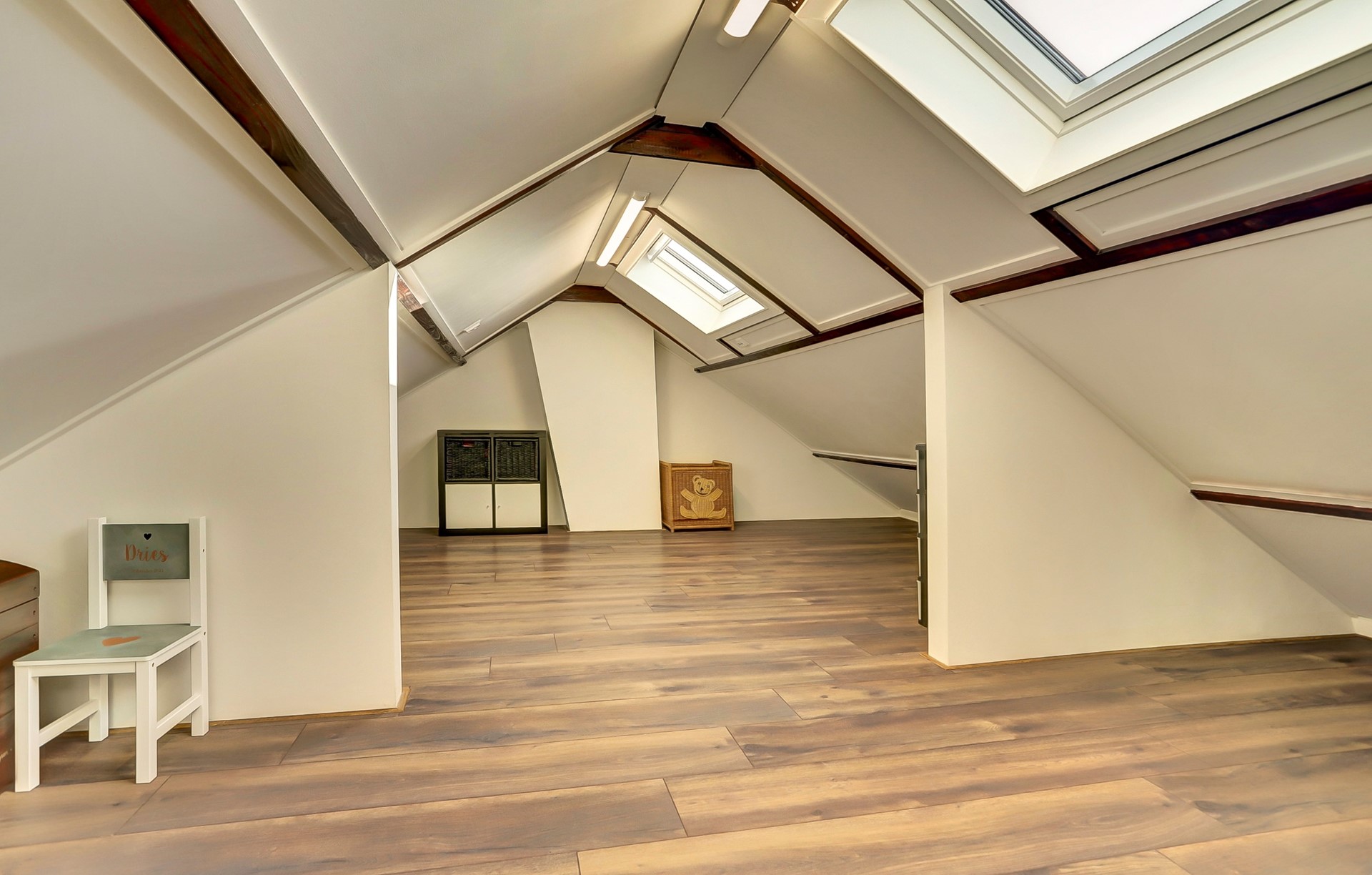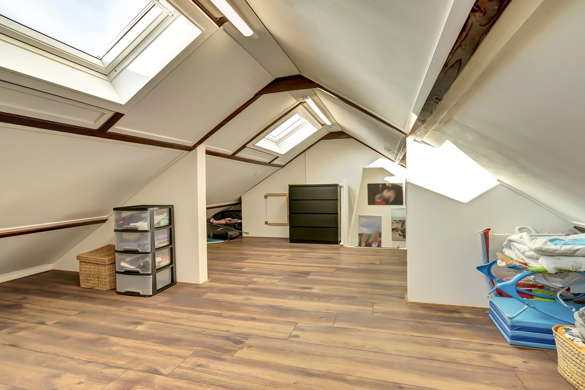 Via de vaste trap bereiken we de tweede verdieping. Deze verdieping is verrassend ruim en beschikt over twee grote nieuwe Velux dakramen (2020) wat zorgt voor veel lichtinval. De ruimte is fraai afgewerkt met een nette donkere laminaatvloer en is uitstekend geschikt alsvierde slaapkamer, hobbyruimte of extra bergruimte.