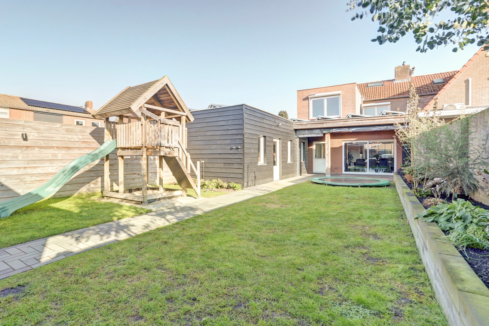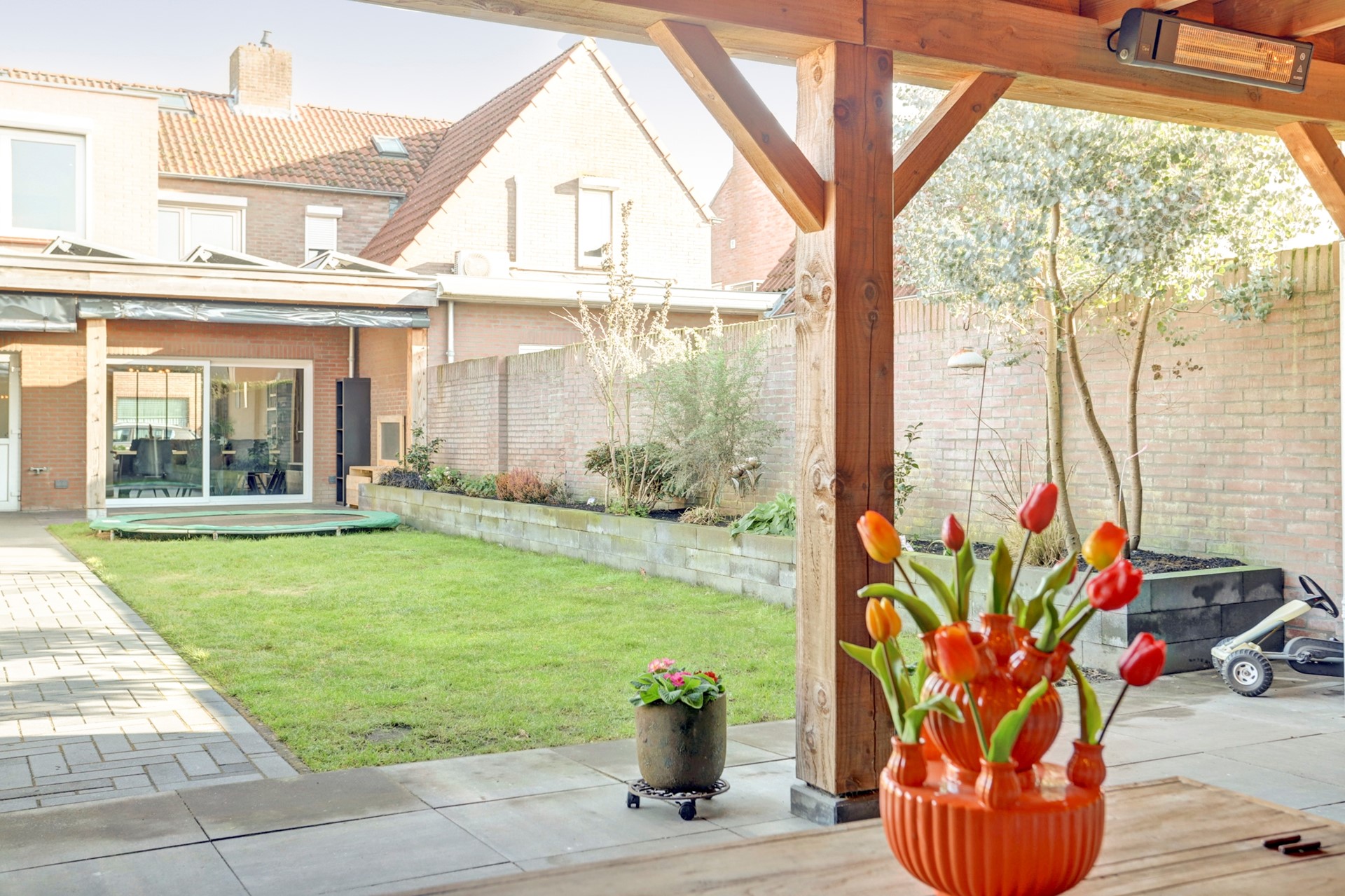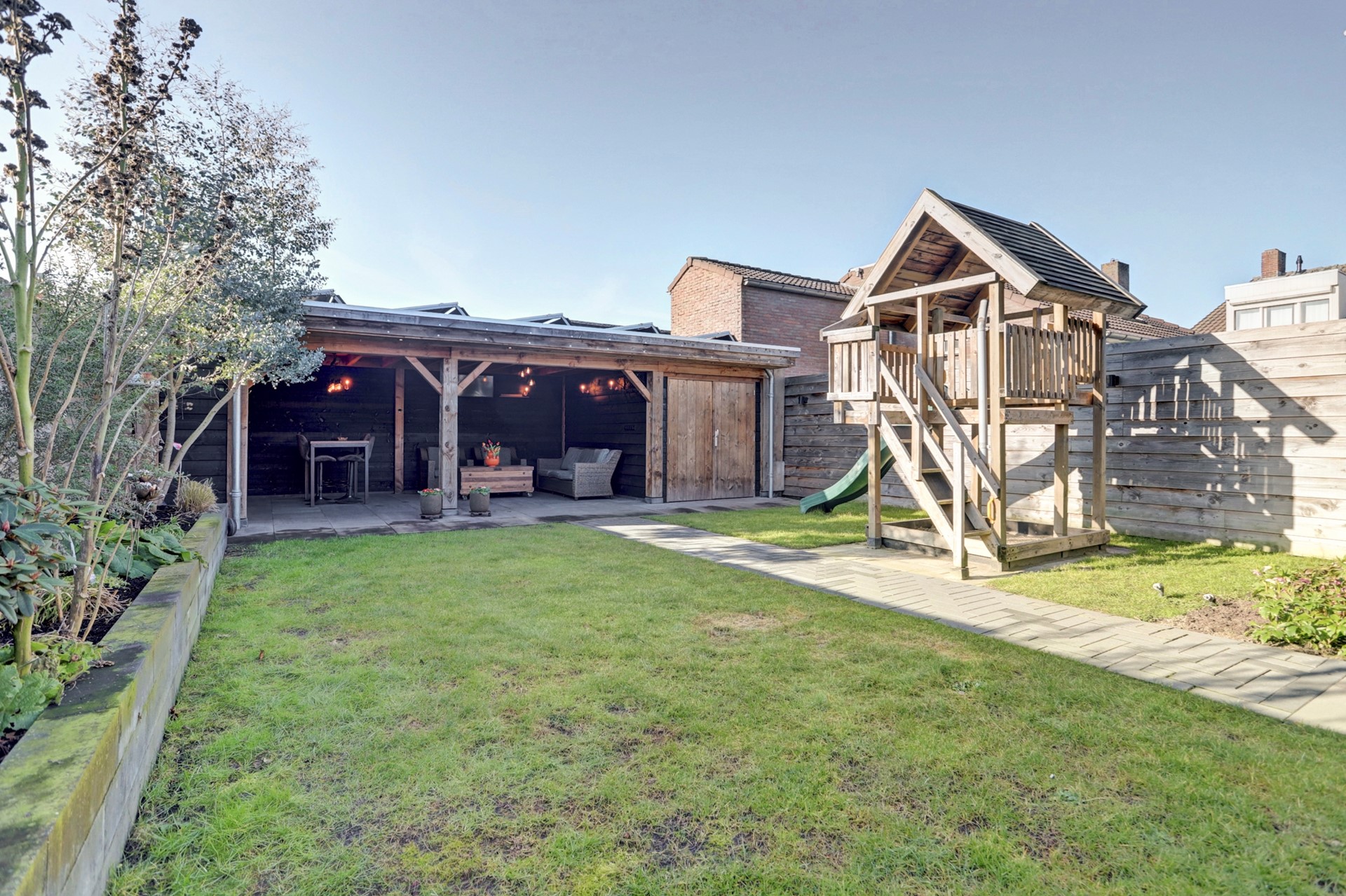 Wat een heerlijke achtertuin heeft deze woning. Met optimale privacy, ligging op het westen beleef je hier plezier voor het hele gezin. De tuin is netjes aangelegd met een groen gazon, verzorgde bestrating en diverse plantenbakken. Direct aan de woning is een prachtige Douglas overkapping geplaatst, afsluitbaar met zeilen en daardoor wind- en waterdicht. Dankzij de grote lichtstraat blijft ook binnen in de woning volop daglicht aanwezig. Deze ruimte wordt momenteel gebruikt als speelruimte voor de kinderen maar is uiteraard multifunctioneel inzetbaar.