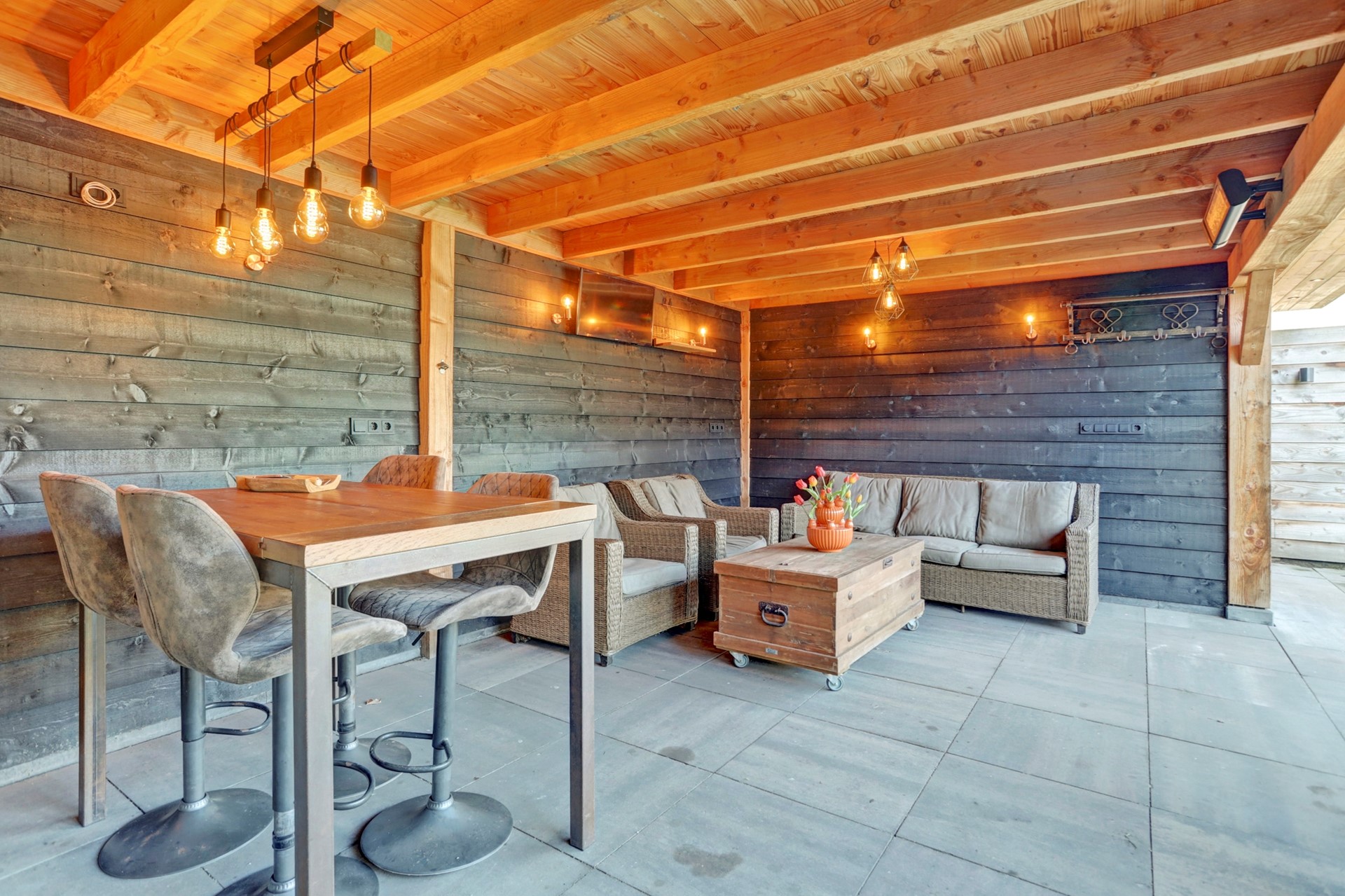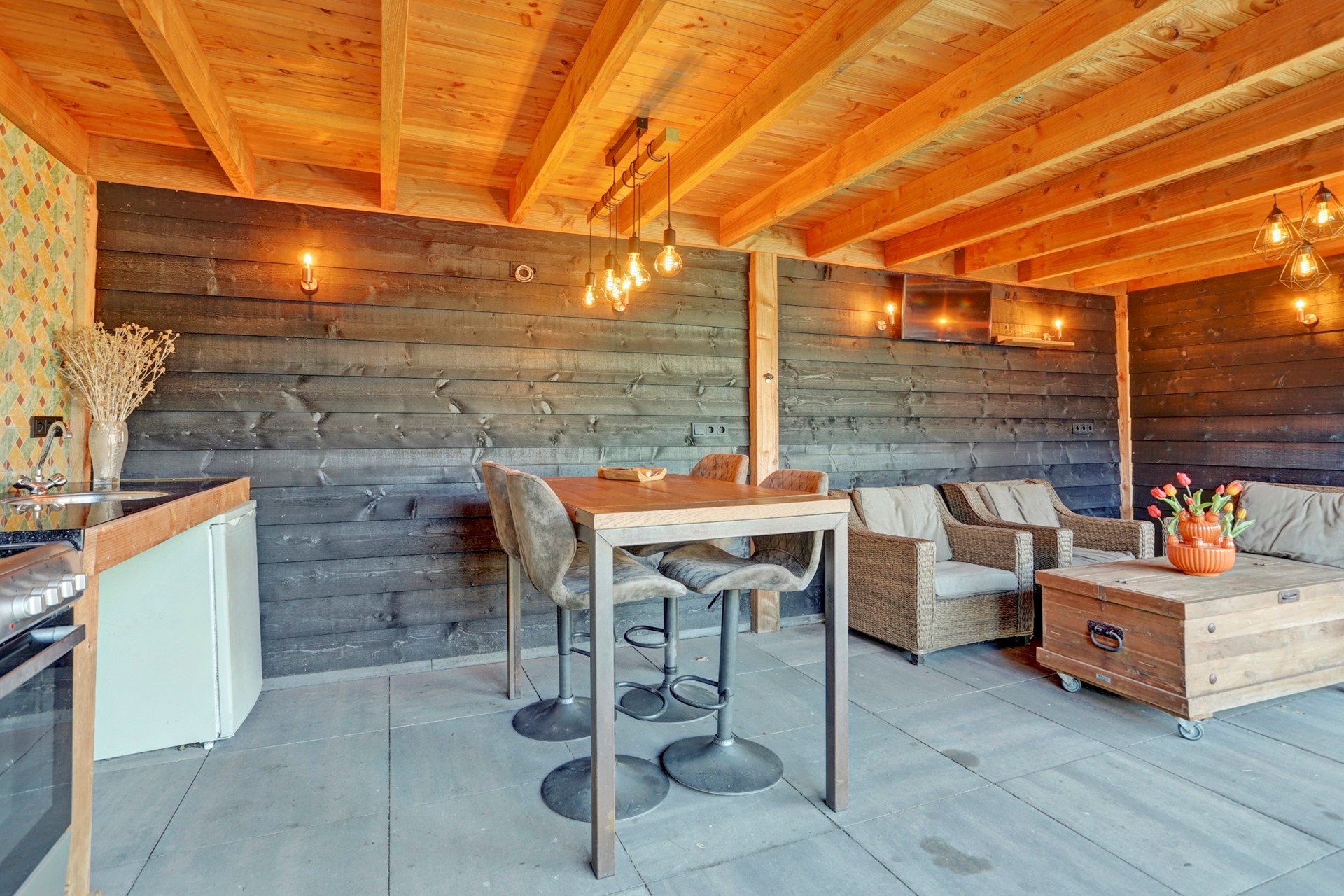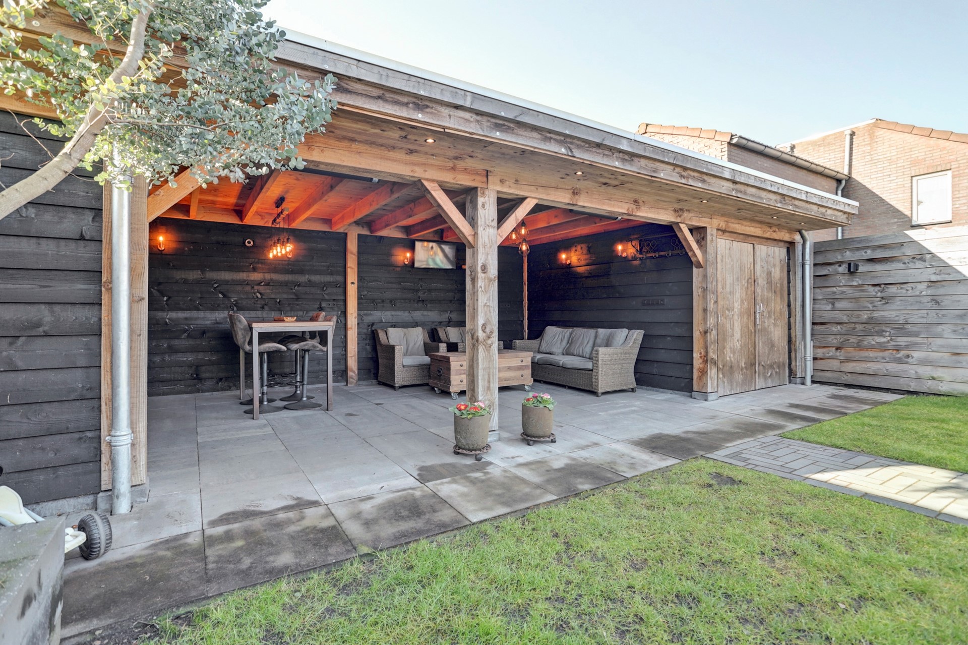 Aan de achterzijde bevindt zich een tweede, royale overkapping met zwart gepotdekselde houten latten en een geïntegreerde berging. Deze overkapping is voorzien van een tv-aansluiting, wateraansluiting, meerdere lichtpunten en is een heerlijke plek om te toeven! Deze overkapping biedt genoeg ruimte voor een heerlijke loungebank met een fraai uitzicht over de achtertuin.