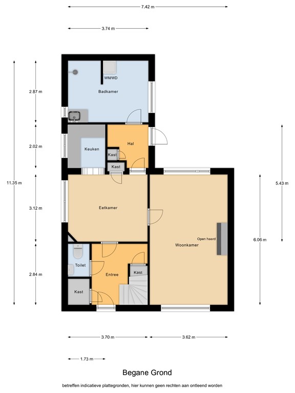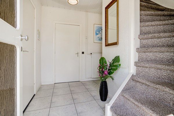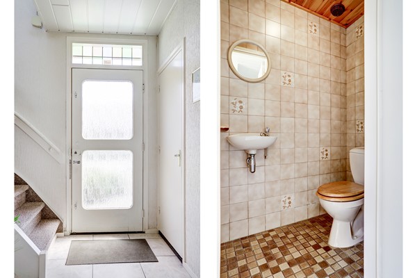 De entree geeft je direct toegang tot de meterkast, geheel betegeld toilet met fonteintje, kelder, eetkamer en trapopgang naar de eerste verdieping.