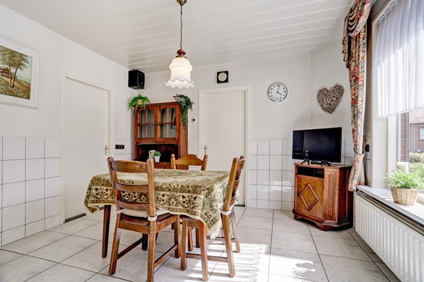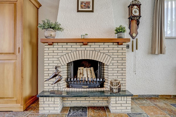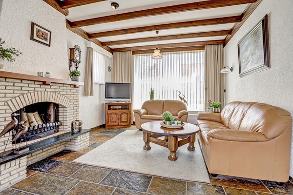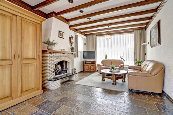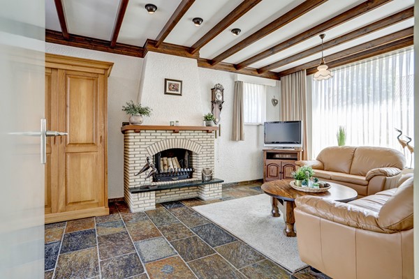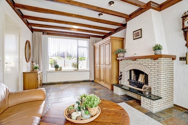 De woonkamer is ruim en licht dankzij de grote raampartijen aan zowel de voor- als achterzijde, welke voorzien zijn van rolluiken. De sfeervolle schouw met open haard zorgt voor extra warmte en gezelligheid. De ruimte is afgewerkt met een tegelvloer en stucwerk op de wanden. Het plafond is voorzien van houten sierbalken.