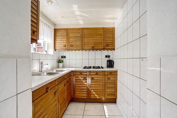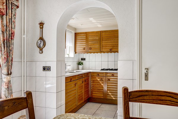 De open keuken is praktisch ingericht in een hoekopstelling en voorzien van een 4-pits gaskookstel, afzuigkap en een dubbele wasbak met mengkraan. Vanuit de eetkamer heb je direct toegang tot zowel de woonkamer als het achterportaal.