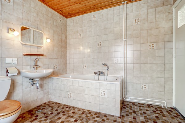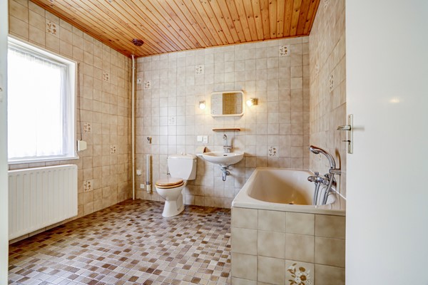 De ruime en geheel betegelde badkamer is voorzien van een ligbad, closet en een wasbak met mengkraan. Deze ruimte biedt dan ook meer dan voldoende ruimte om hier jouw droombadkamer te realiseren. Het vlizoluik bevindt zich in de badkamer.