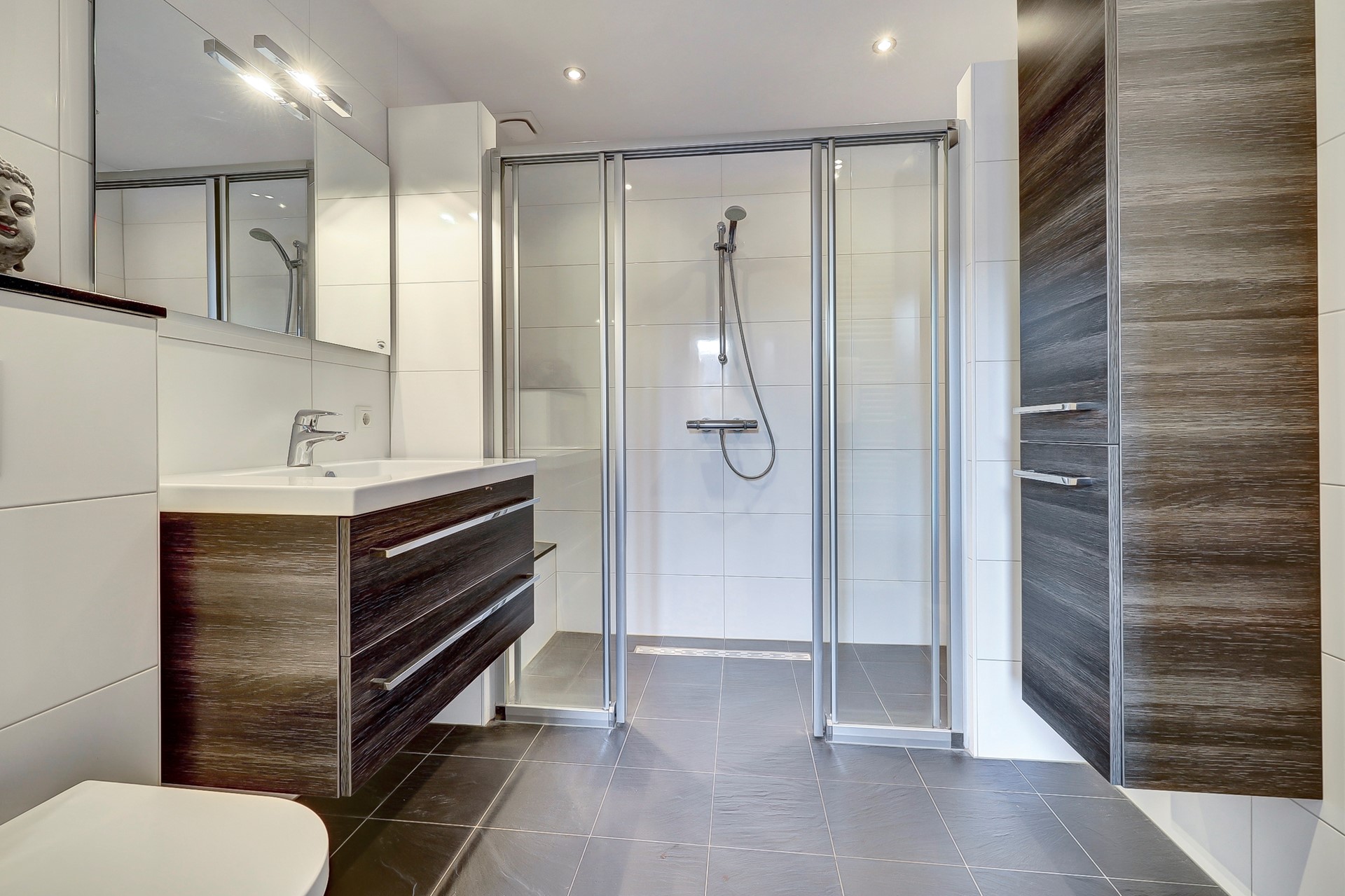 Deze prachtige gerenoveerde badkamer is helemaal klaar voor de toekomst en combineert comfort met gemak op perfecte wijze. Je vindt hier elektrische vloerverwarming, een royale inloopdouche, een grote wastafel met bijpassend meubel, volop kastruimte, een hangcloset én een stijlvolle designradiator.