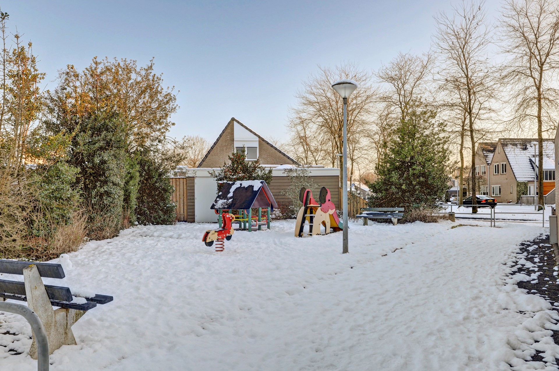 De voortuin is netjes groen aangelegd met plantenborders en vormt een verzorgde entree naar de woning. Via het looppad bereik je de voordeur van deze comfortabele woning.
